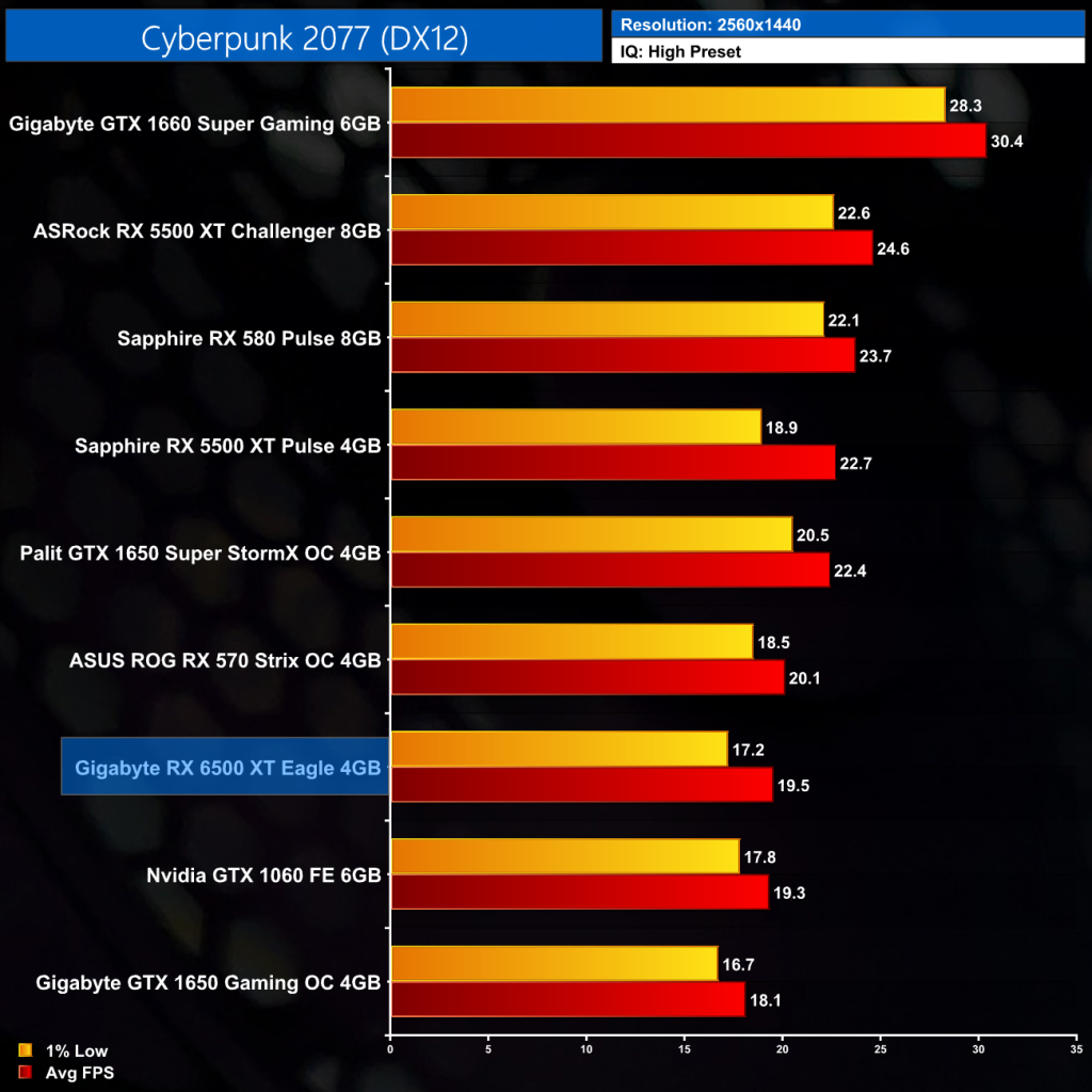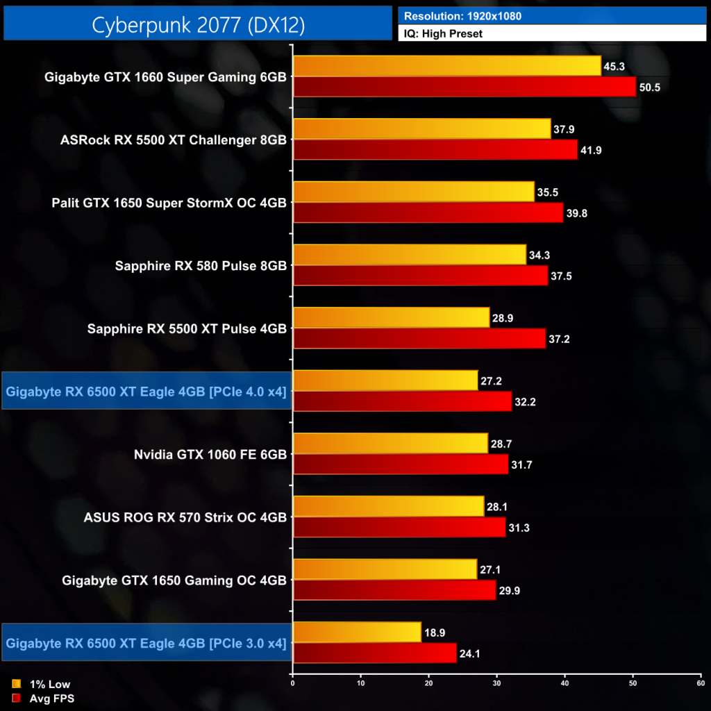 Unfortunately, Cyberpunk 2077 shows us the exact same thing. Performance is really no better than what we get from a GTX 1060 6GB, and it is actually 13% worse than the 5500 XT 4GB, a GPU which launched at £160 over two years ago. And then when we test at PCIe 3.0, you can knock off another 25% of the 6500 XT’s performance, for a lovely 24FPS experience…
