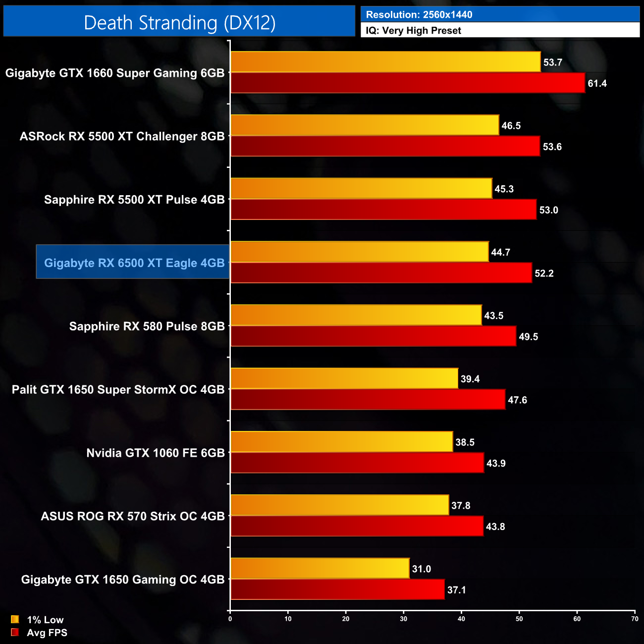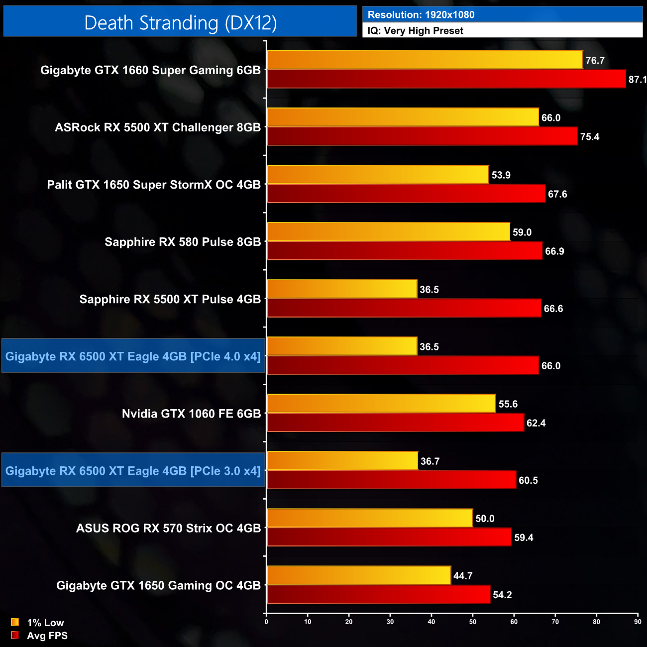 Death Stranding is next and the average frame rate here is actually not dreadful. It’s no better than the RX 580 however, which is a big disappointment. We can see significantly reduced 1% performance too, though this was also the case for the 4GB RX 5500 XT which makes me think it’s likely a memory or PCIe bandwidth issue for both of those cards. Cutting PCIe bandwidth to Gen3 here doesn't result in as drastic performance losses as our first two games, but the 1% lows are still poor and the average frame rate is down by 8%.