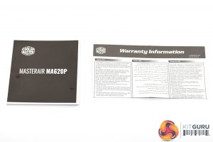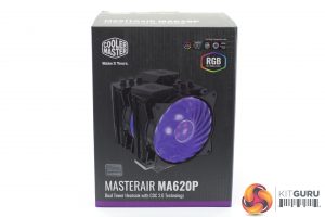 The MA620P ships in a dark box with a large image of the cooler on the front. The RGB fan is very visible as that is a key feature of the new MasterAir products.