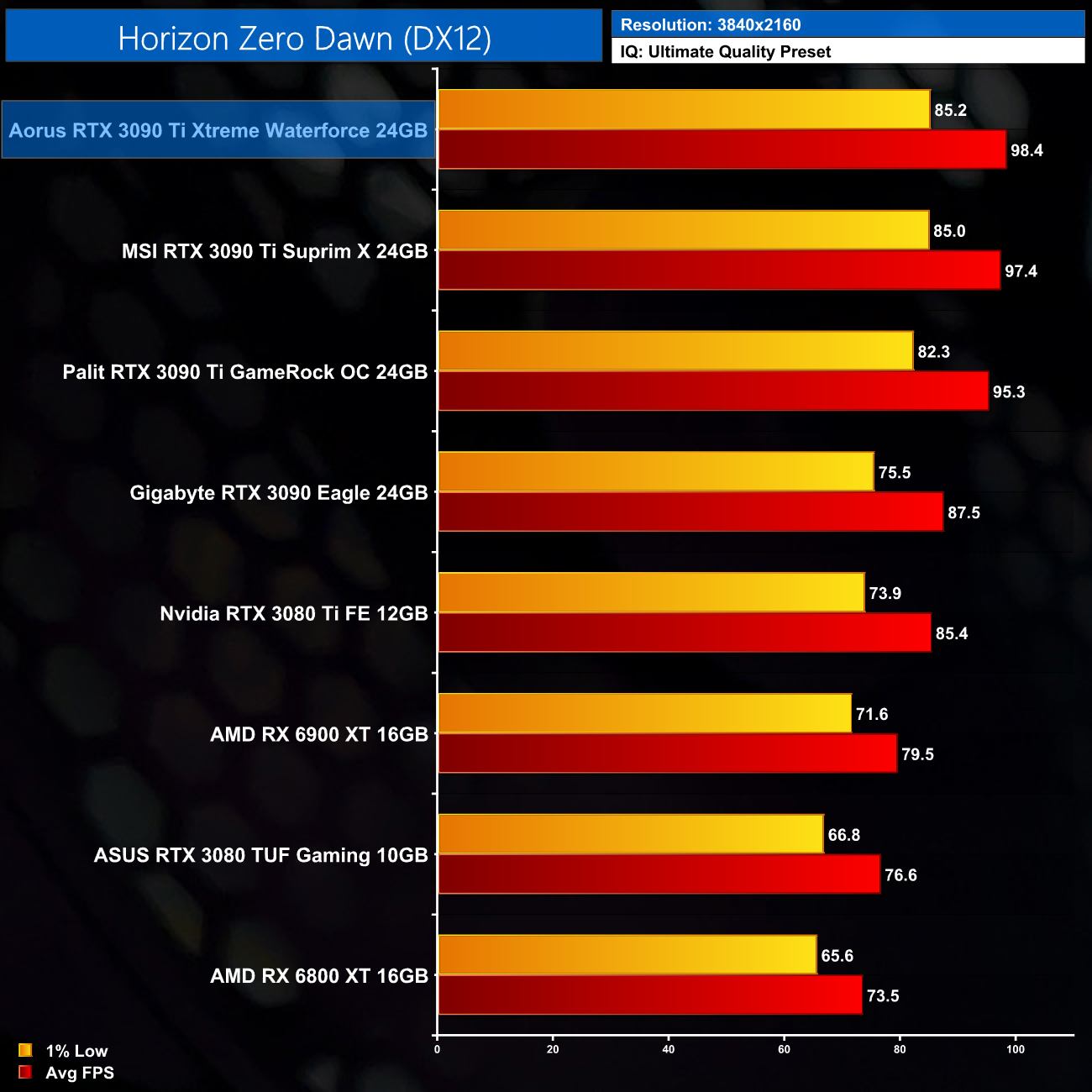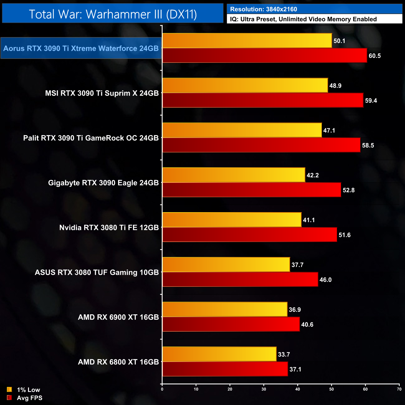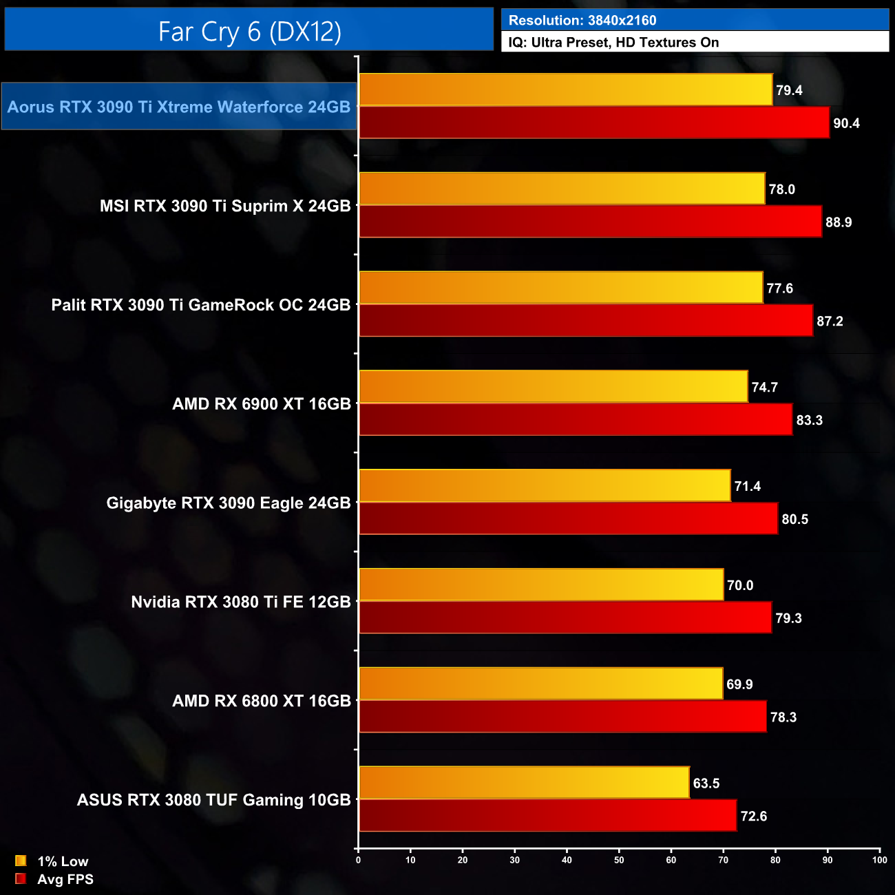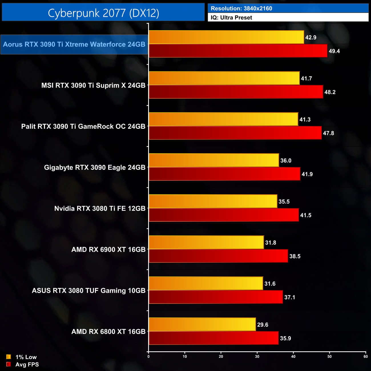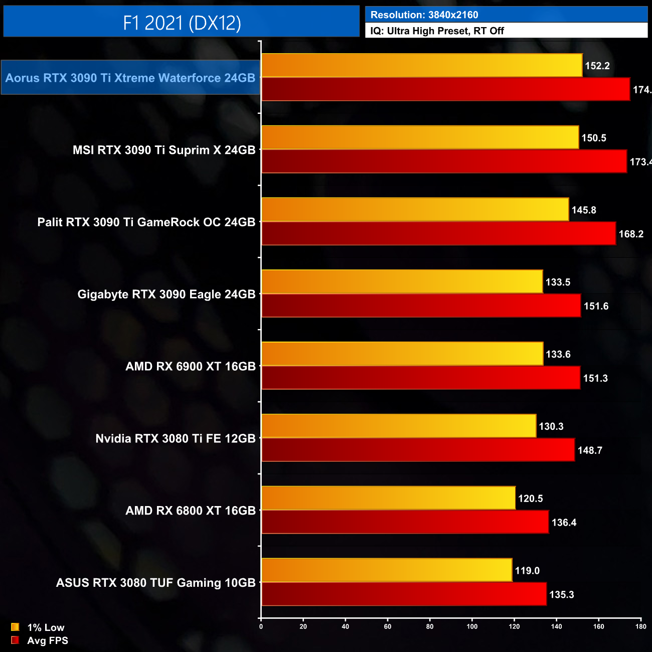 The reason we don't focus on as many game benchmarks becomes clear when looking at the results shown here. Comparing the Xtreme Waterforce against the MSI Suprim X, we only saw an average difference of 2% in favour of the Aorus, with a 3% margin at the very most. Realistically, I don’t think you’d notice the difference in frame rates when actually playing games, but on paper the Aorus Xtreme is the fastest 3090 Ti we have tested so far.