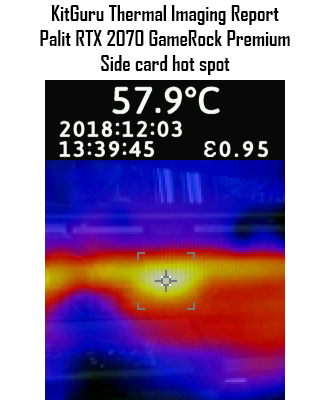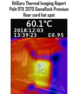 The excellent temperature for the GPU core is reflected in our thermal imaging camera results – the hottest spot on the PCB proved to be barely over 60C, and that was in the area directly behind the GPU core. Even then. it is still a very low temperature indeed, so again – a top result for Palit here.