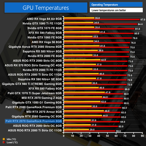 Moving onto thermals, it is mighty impressive to see the GameRock Premium peak at just 64C on the core when under load. This makes it one of the best results we have seen from the current generation of cards – so hats off to Palit for that.