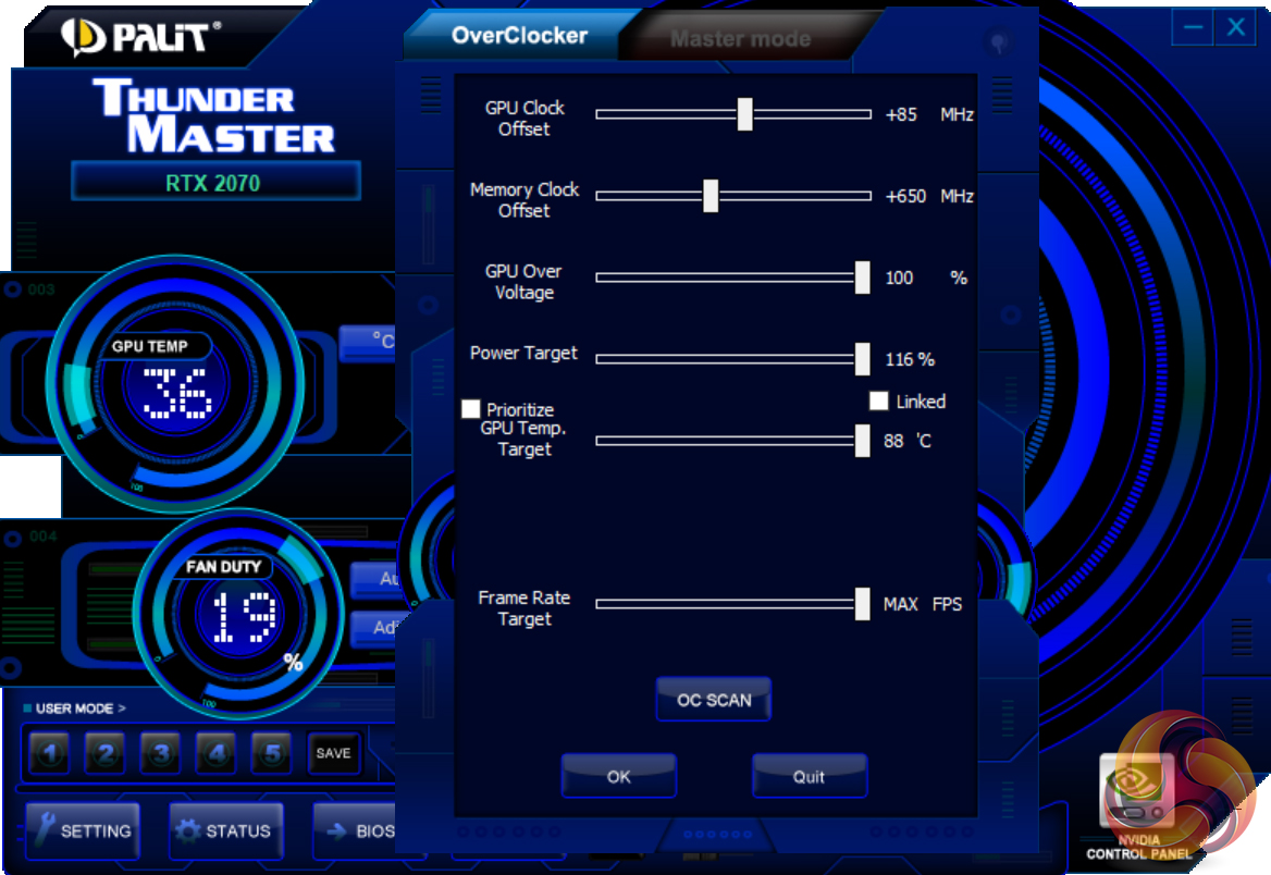 When overclocking the GameRock Premium, we used Thunder Master – Palit's dedicated tool. We settled with +85MHz to the GPU and +650MHz to the memory. +105MHz was stable in Time Spy, but caused crashes with Shadow of the Tomb Raider, so we had to dial it back.