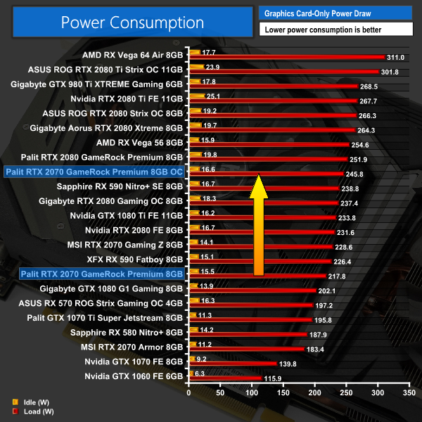 The Palit was able to handle this overclock very well. Temperatures rose 3C to 67C, which is still a very good result, while noise levels rose just over 1dB – though it would be very hard to notice the difference in the real world. Power consumption jumped up by around 28W, too, but again that is hardly cause for concern.