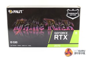 The Palit RTX 2070 GameRock Premium ships in a glossy black box, with the GameRock logo spilled across the front – there is no image of the card itself visible from the front.
