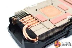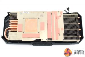 The heatsink is also identical to that of the GameRock Premium 2080, meaning it utilises 5 thick copper heatpipes – each of which looks like they measure 8mm in diameter – with a copper contact area for the GPU die. The VRAM and VRM also has a dedicated coldplate to aid heat dissipation, and there are plenty of thermal pads in a distinctive salmon colour.
