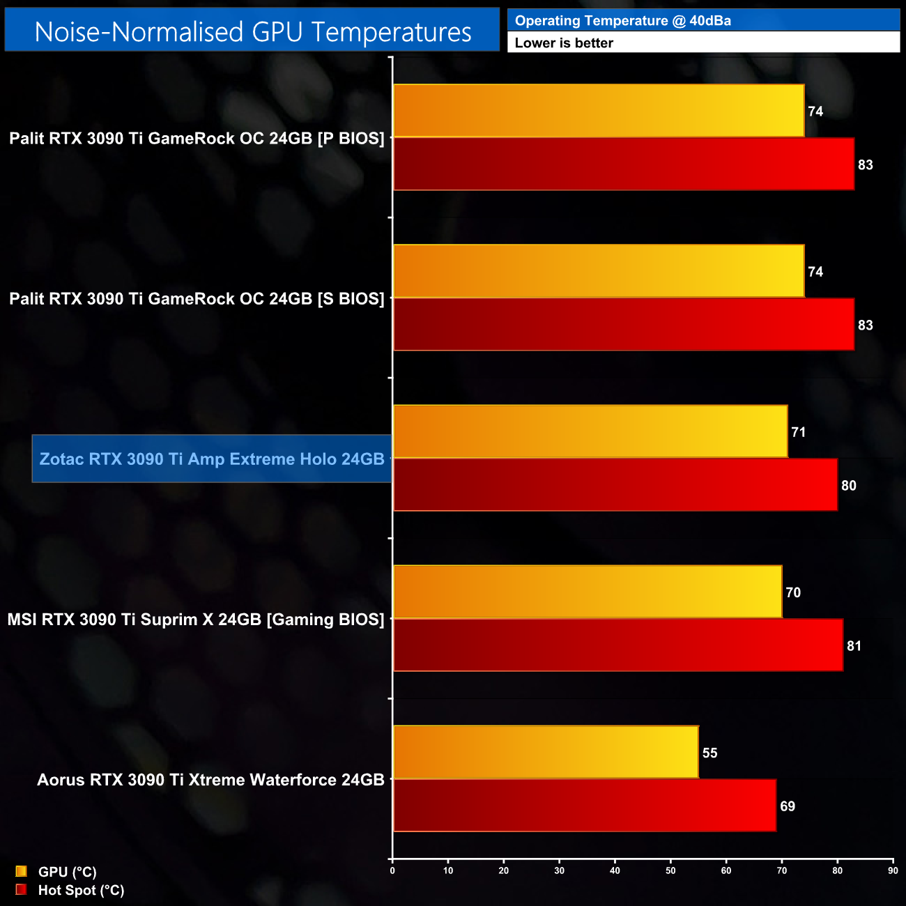 Following on from our stock thermal and acoustic testing, here we re-test the operating temperature of the GPU, but with noise levels normalised to 40dBa. This allows us to measure the efficiency of the overall cooling solution as varying noise levels as a result of more aggressive fan curves are no longer a factor.
