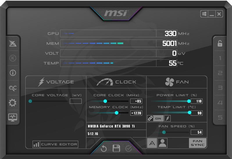 With the power limit set to its maximum value (110%), we were able to add 85MHz to the GPU and 1220MHz to the GDDR6X memory.