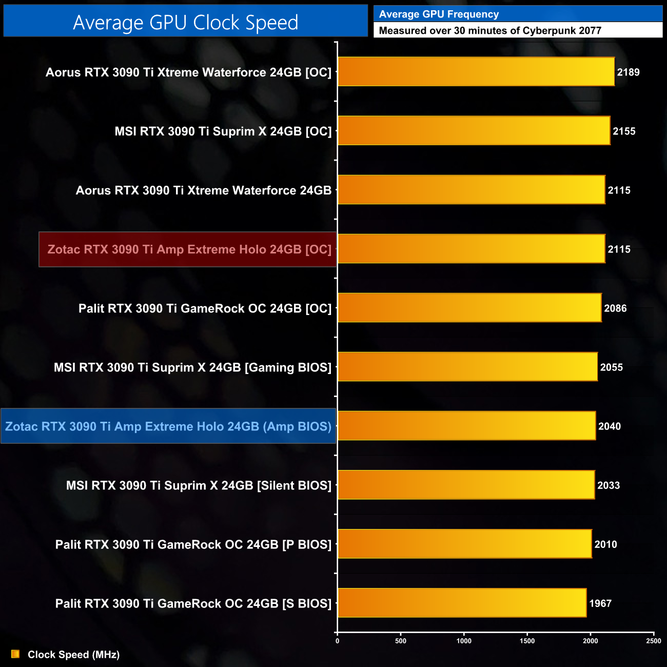 This resulted in a real-world clock speed of exactly 2115MHz, meaning the MSI Suprim X ran 40MHz faster when overclocked.