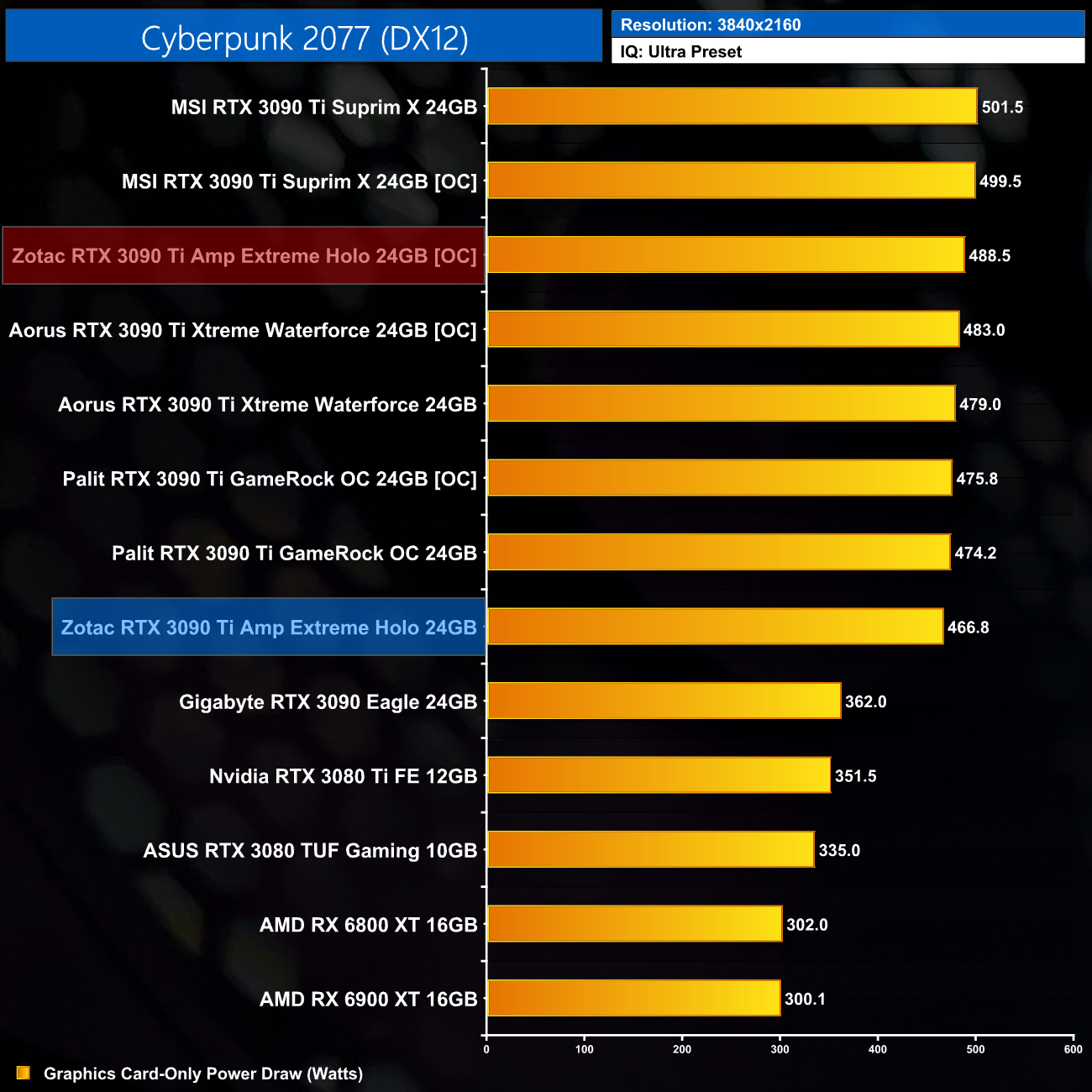 Power draw did rise as well however, from 467W up to 489W, but what's an extra 22W of juice when you're spending nearly £2000 on a graphics card?