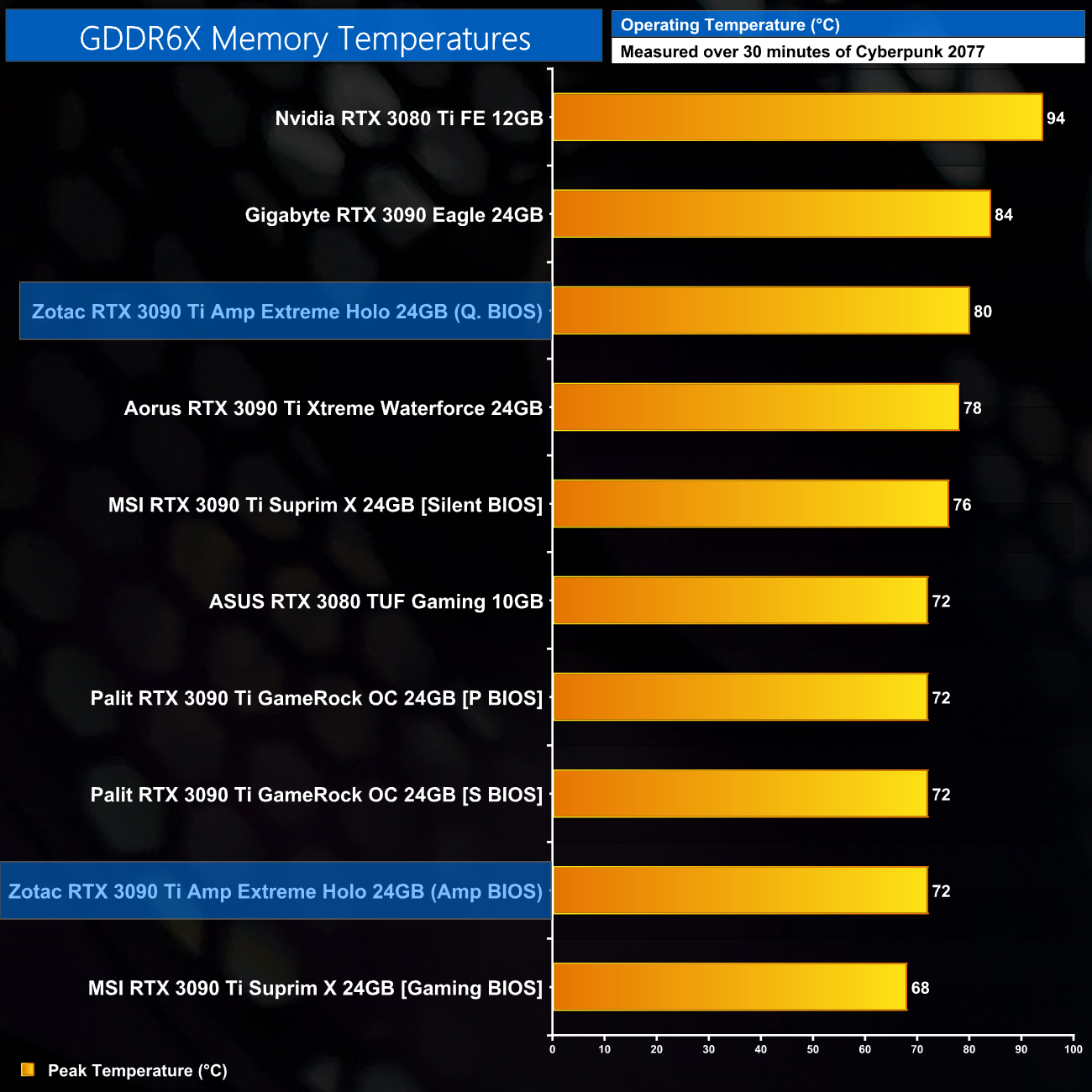 Likewise, GDDR6X temperatures are no problem for the Amp Extreme Holo. The Amp BIOS saw a peak of just 72C, while the Quiet BIOS saw the memory run 8C hotter. Both results are absolutely fine for memory of this calibre and are competitive against the likes of the Palit GameRock OC and MSI Suprim X.