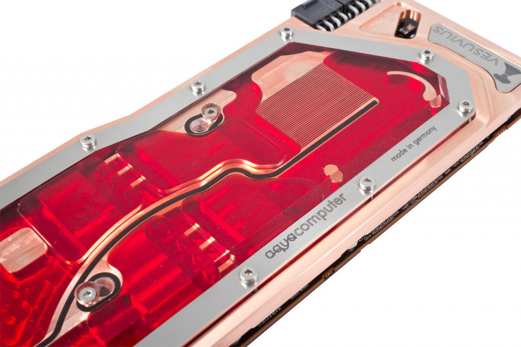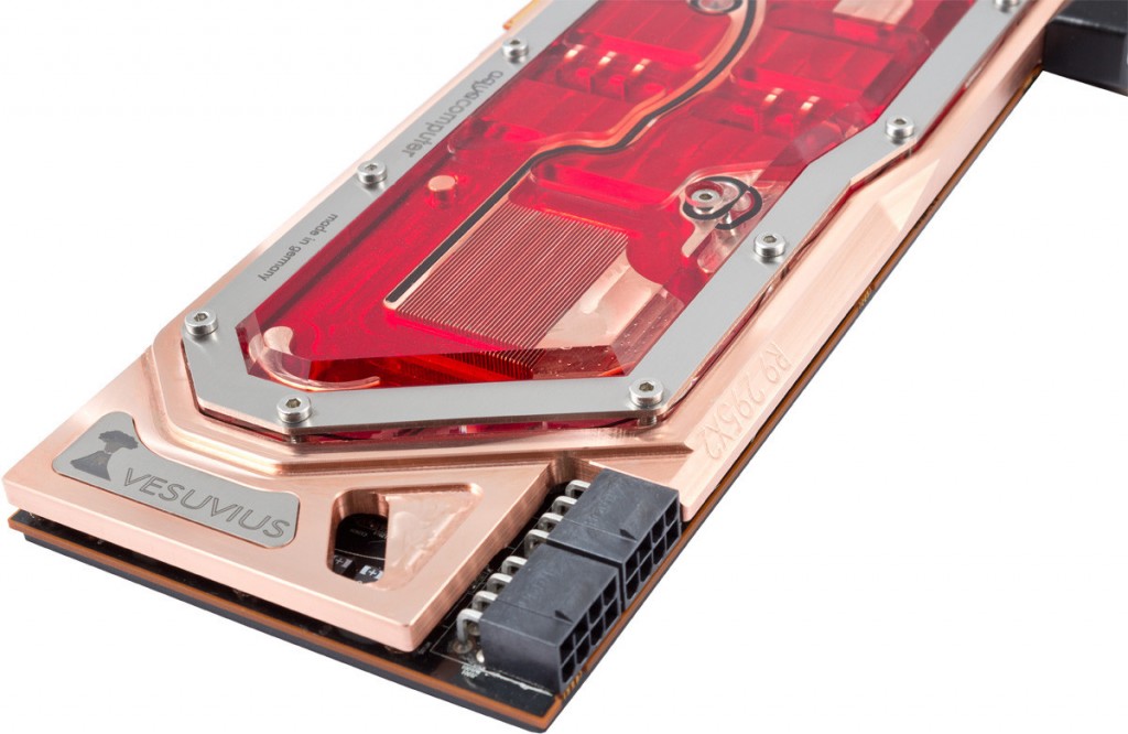 The kryographics Vesuvius water-block is entirely made in Germany and milled from 2.72kg high-purity electrolytic copper raw material, according to the press release published by TechPowerUp. The water-block covers two graphics processors, GDDR5 memory, voltage regulators and PCI Express bridge chips, the components that heat a lot during operation.