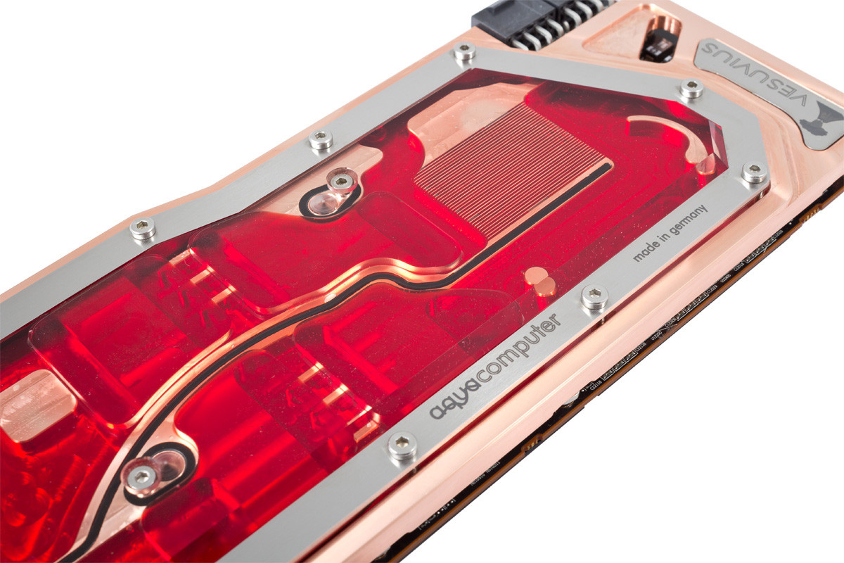 All areas are covered by the flow path of the cooling liquid to ensure efficient cooling of all components. To ensure maximum cooling performance of GPUs, both AMD Radeon “Hawaii” chips are covered by a micro structure with 0.5mm grid. The water flows through both structures in parallel which allows an even temperature for both GPUs. To achieve this effect the cooling structures use a different depth which makes sure that the same amount of water flows through both of them.