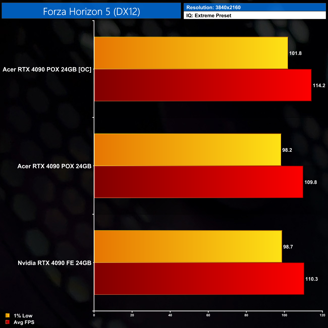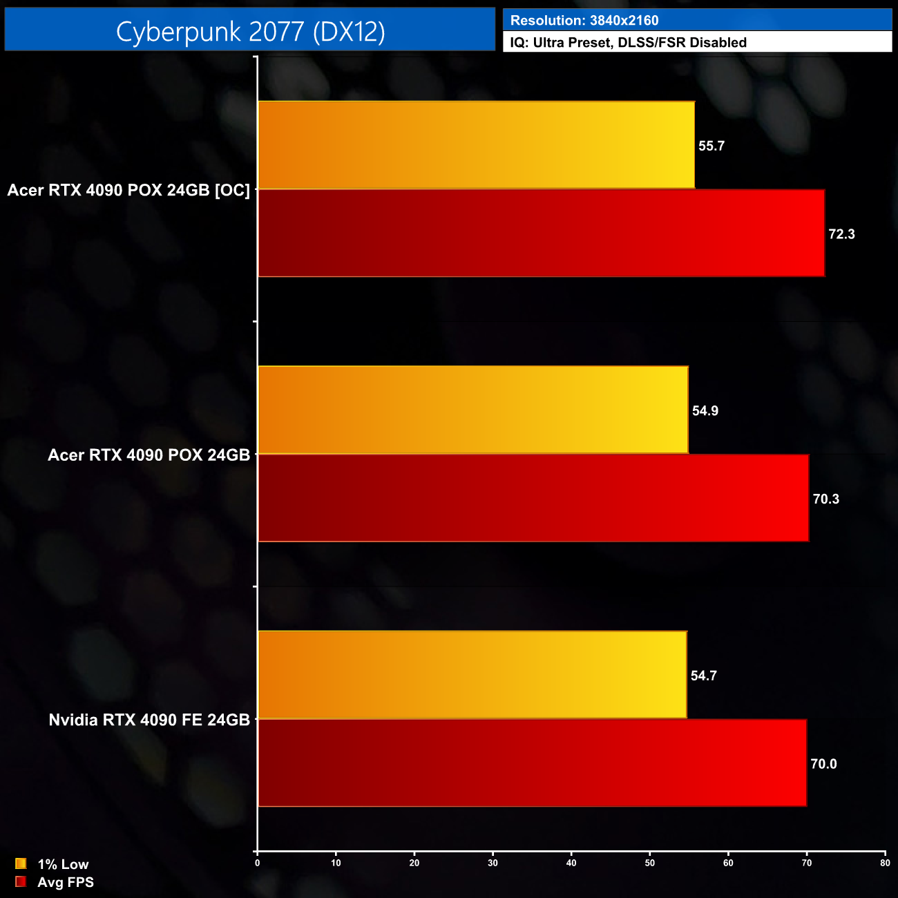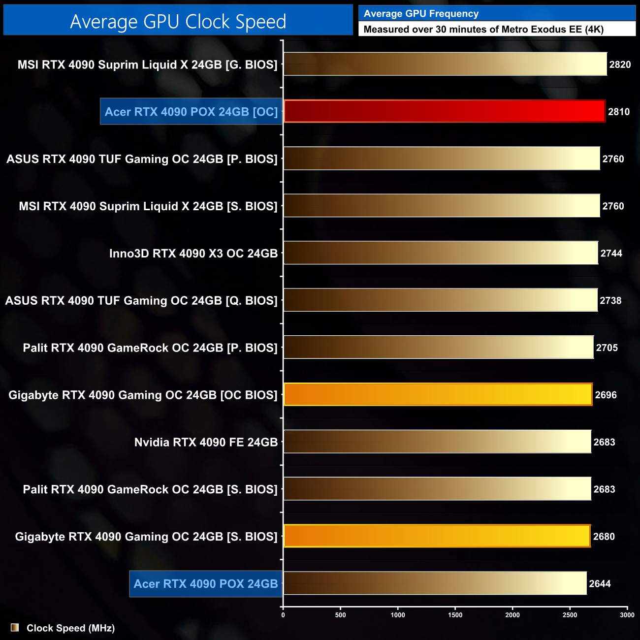 Interestingly, Acer has restricted the power limit for the 4090, in that it cannot be increased over 100% (450W). Our best result came with an extra 205MHz added to the core, and 1475MHz added to the memory.