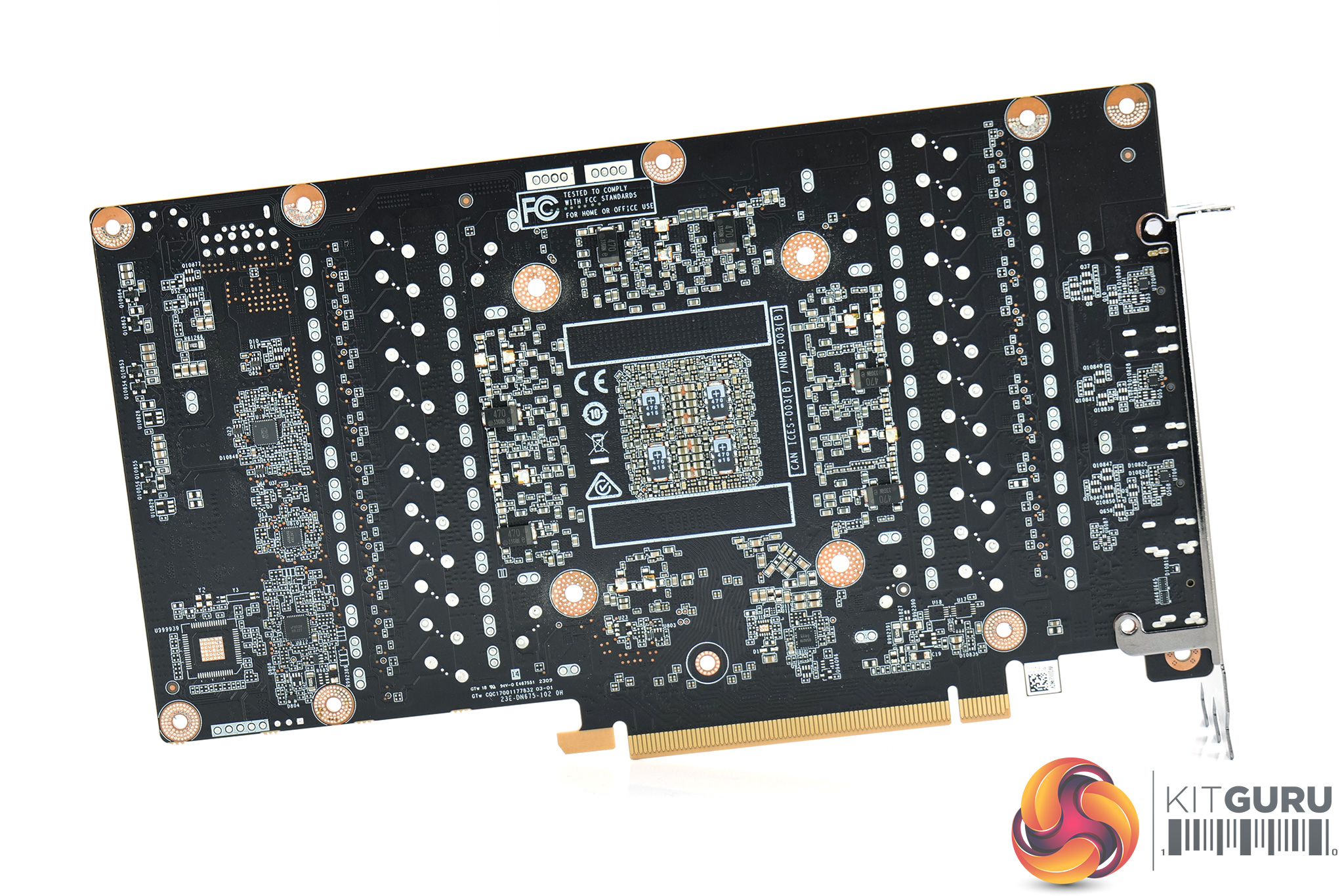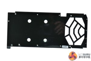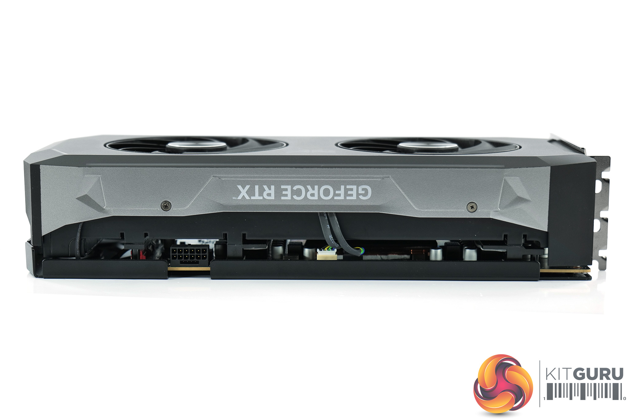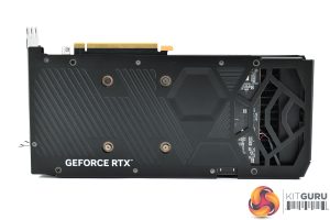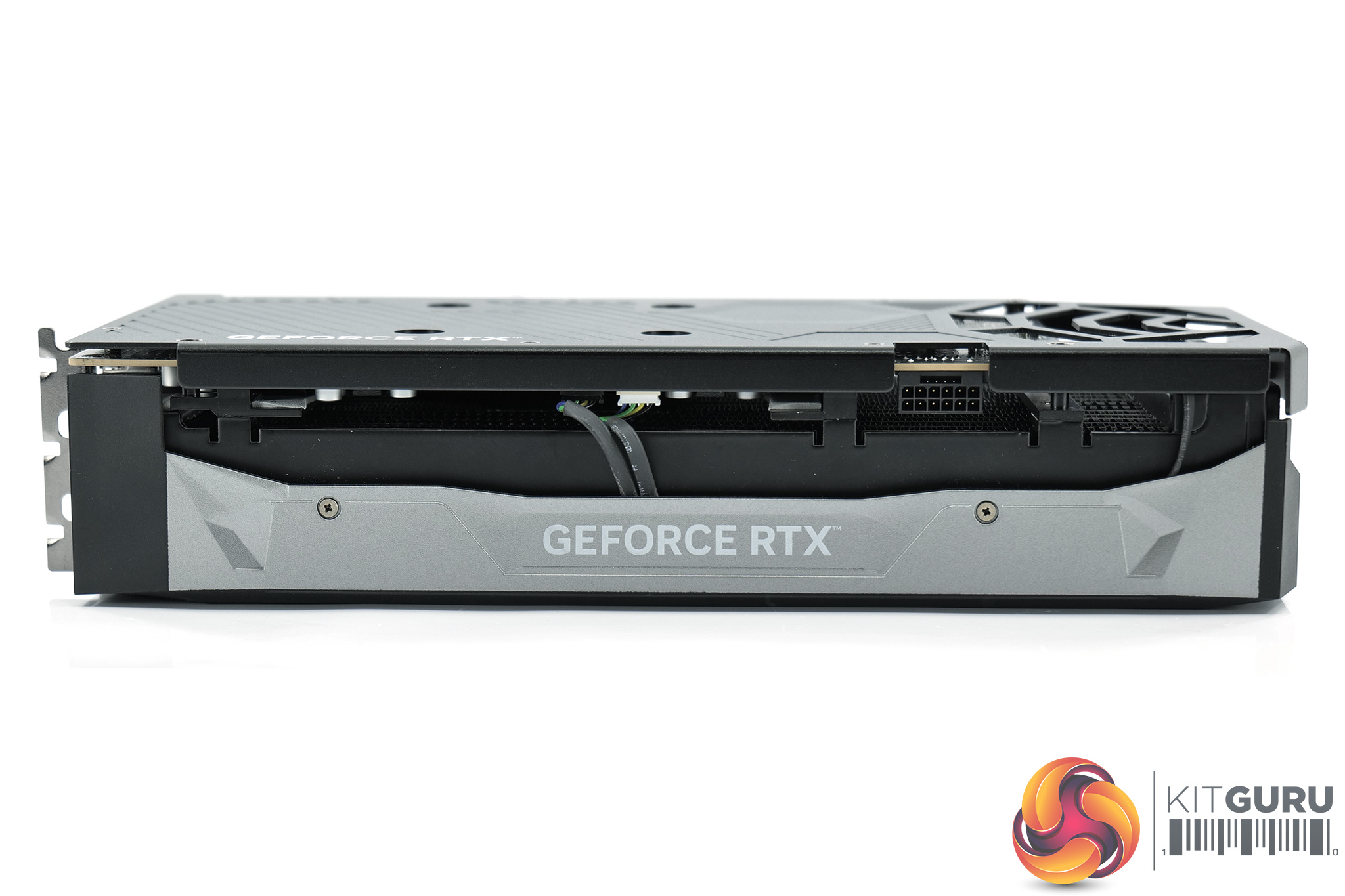 Over on the front side, the shroud here is a grey plastic and houses the GeForce RTX logo. The backplate is made from black metal, and it does feature a few cut-outs to allow air to pass directly through the heatsink. There's no dual-BIOS switch on the card however.