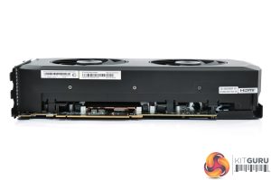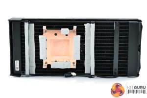 The cooler is arguably the most interesting thing about the whole card, as it's actually using liquid cooling, via a pump and radiator that sit within the shroud itself. The GPU and memory contact a copper baseplate, with the liquid flowing beneath that contact plate and then through the radiator. The pump is built into the radiator, on the right hand side (when look at the image above). The radiator itself measures approximately 270mm long, 116mm tall and is 29mm thick.
