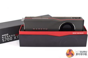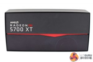 The AMD Radeon RX 5700 XT ships in a compact box, with just the product branding visible on the front. Removing the outer sleeve, we can see the box is in two parts – the top lifts off to reveal the card sitting in a foam surround.