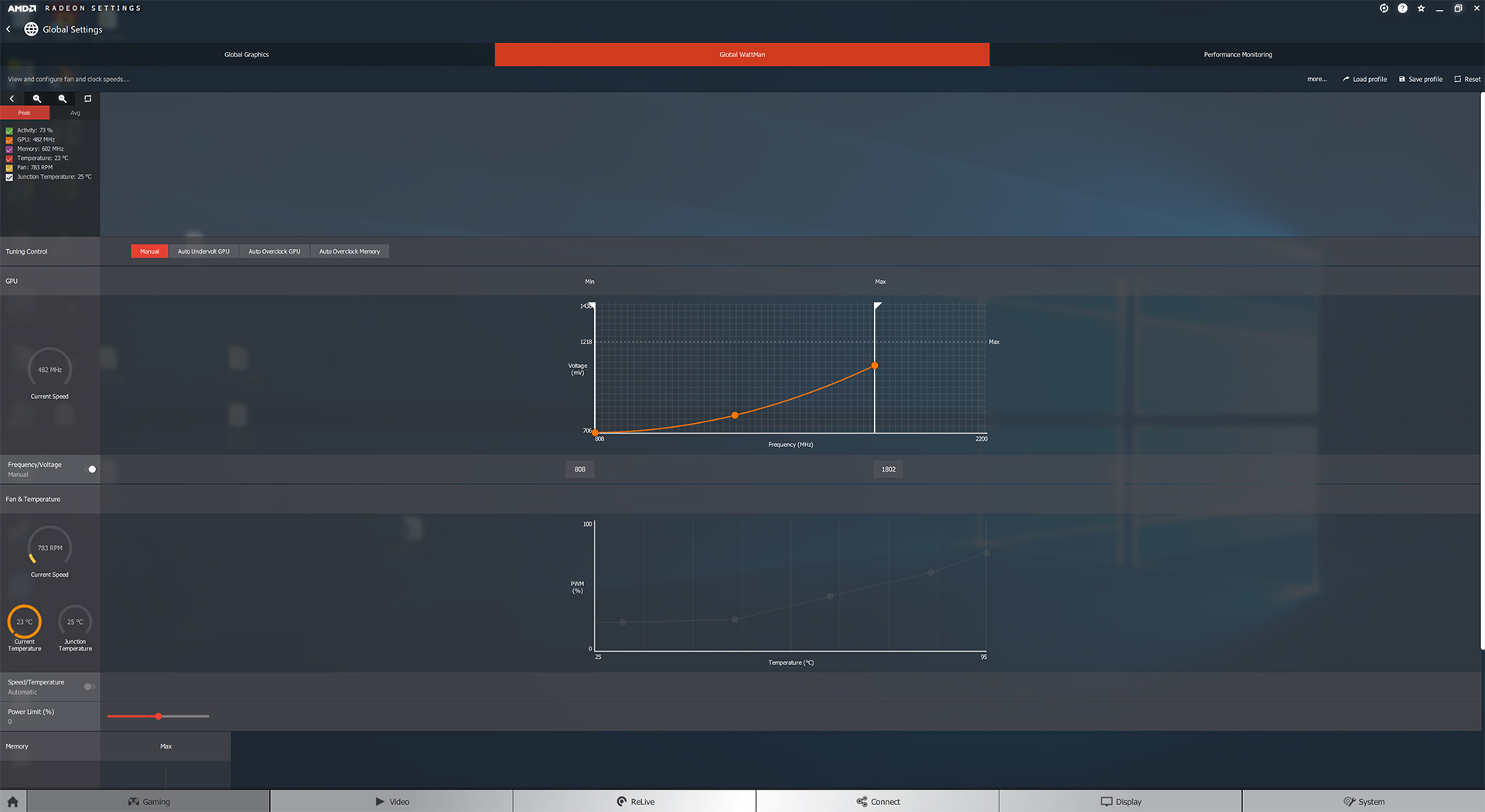 For the Radeon VII, manual tweaking is done via a frequency-to-voltage curve, with the stock peak figures being 1802MHz at 1084mV. Unfortunately, I had very poor results from any manual tweaking of this curve – and I tried all sorts, including setting a low voltage with a high frequency, or setting a high voltage with a lower frequency, and then pretty much everything in between.