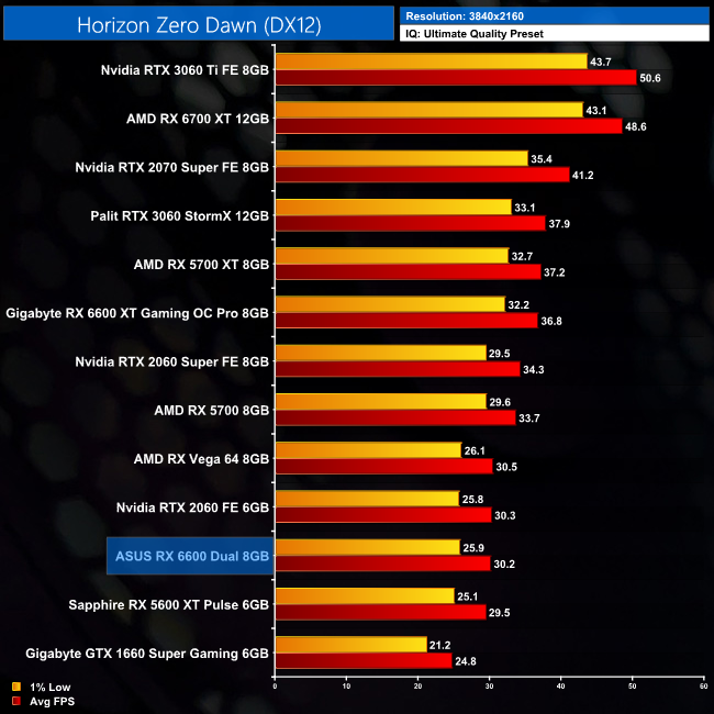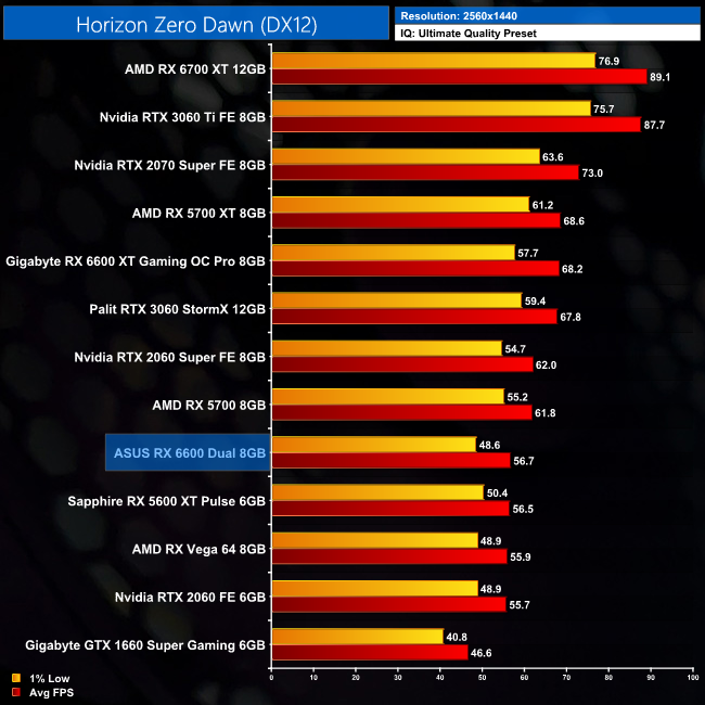 Next is Guerilla Games' Horizon Zero Dawn, running on the Decima engine. Once again we're seeing high frame rates at 1080p, with the RX 6600 hitting 79FPS using the highest quality settings. That's still not enough for it to match the RTX 3060 though, as it comes in 12% slower.