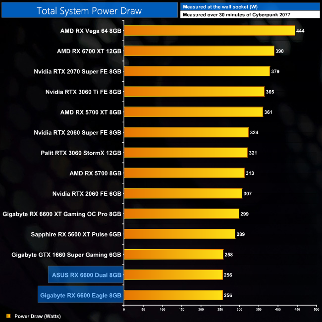 For those interested in total system power draw, RX 6600 will barely put a dent in your PSU. It will depend on your other system components of course, but theoretically this should be fine in something with even just a 300W unit.