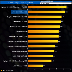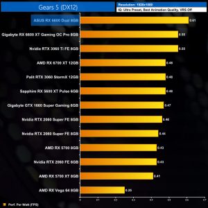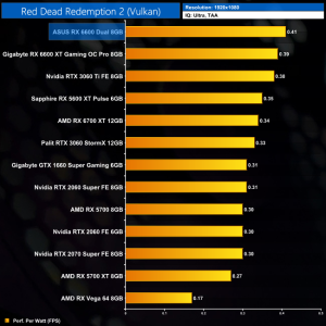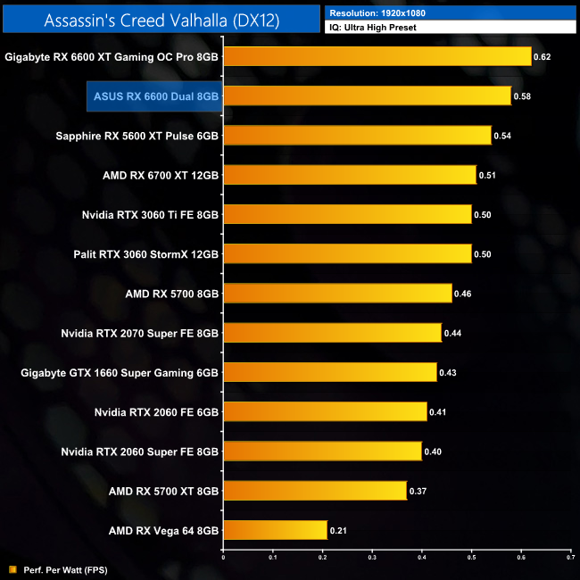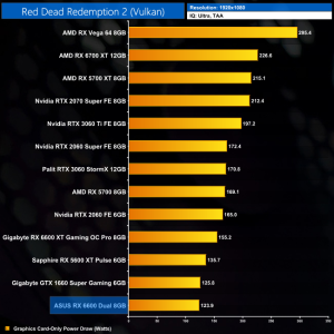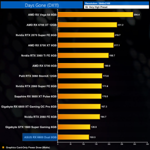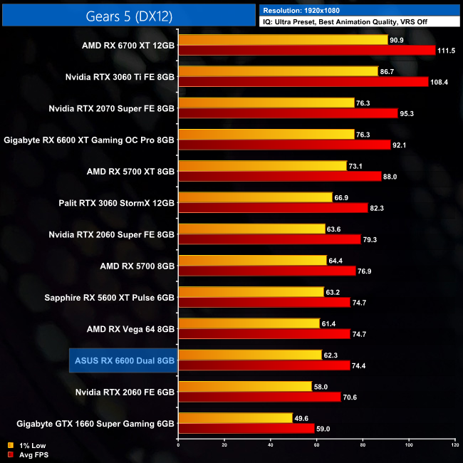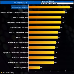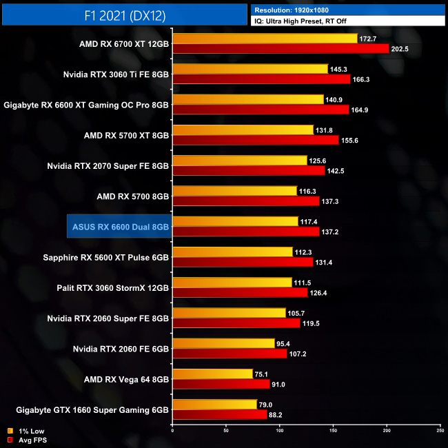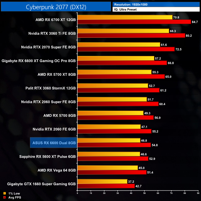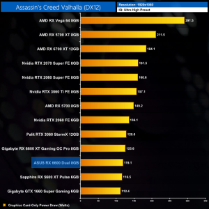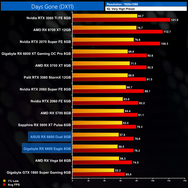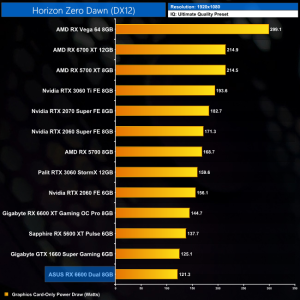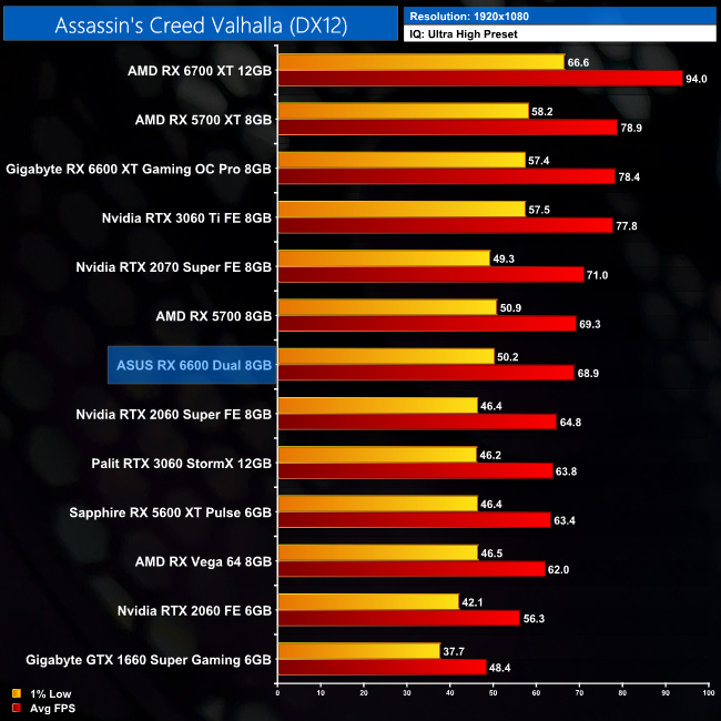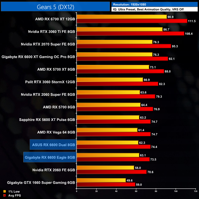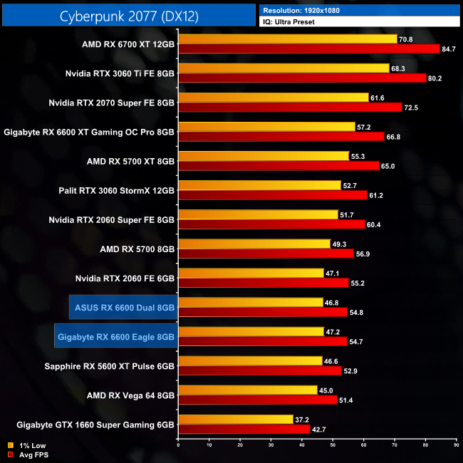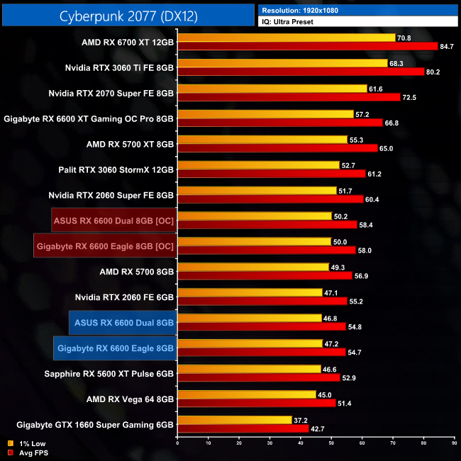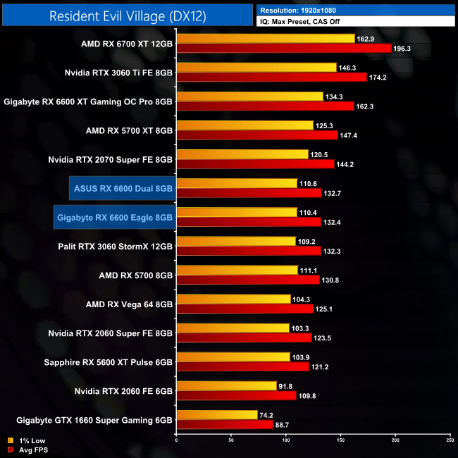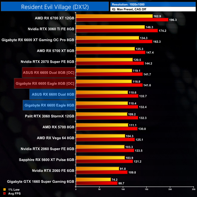 While our primary focus so far has been on the gaming performance of the ASUS RX 6600 Dual, here we include a select sample of 1080p gaming benchmarks, testing both ASUS Dual and Gigabyte Eagle RX 6600 models.
