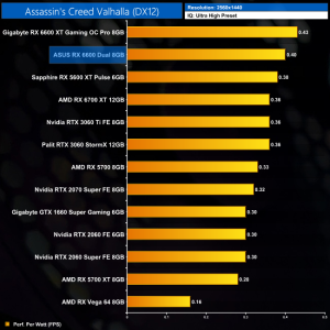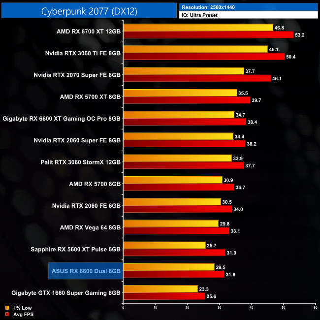That increases to a 16% deficit at 1440p, while we can again see the RX 6600, RTX 2060 and RX 5600 XT are all on level pegging around the 56FPS mark.