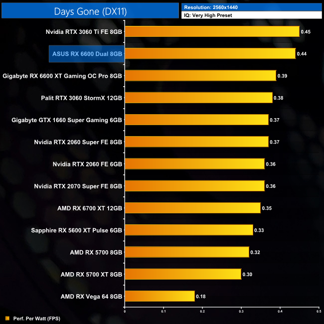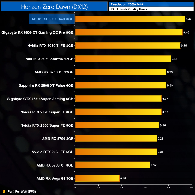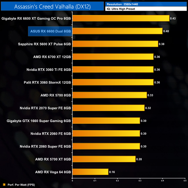 At 1440p, the 6600 is still sitting on top of our chart, so even though the gaming performance drops off slightly, it's still the most efficient GPU at this resolution.