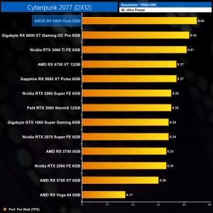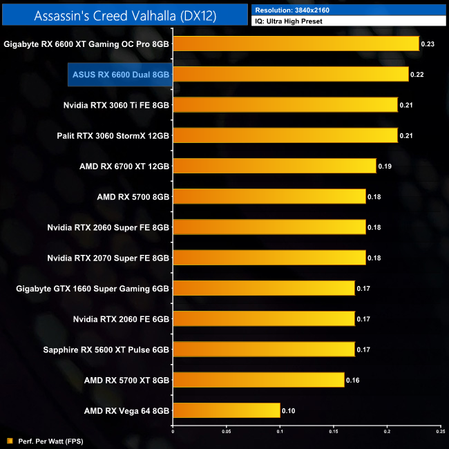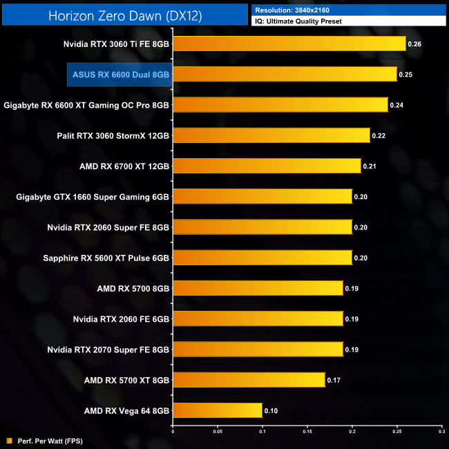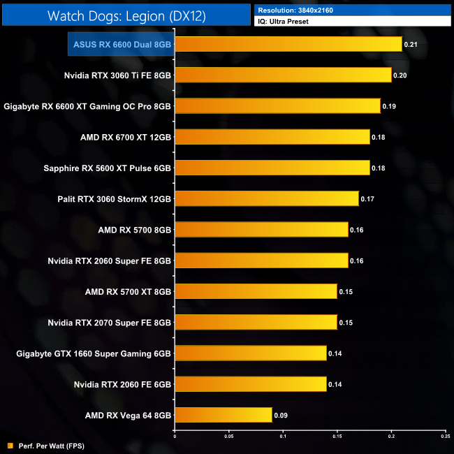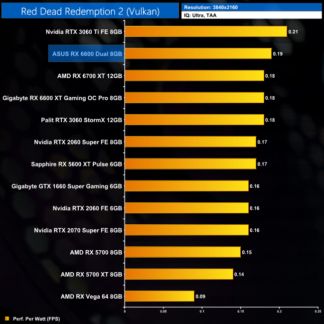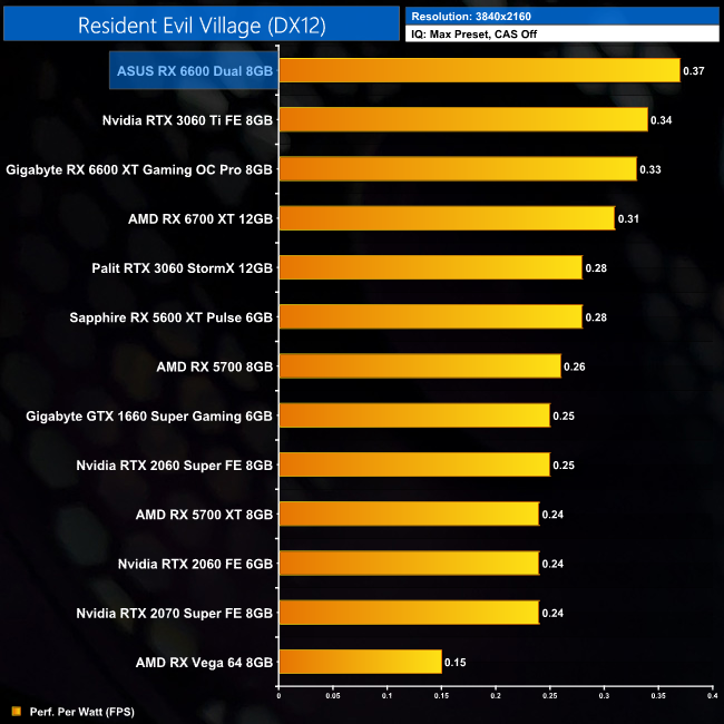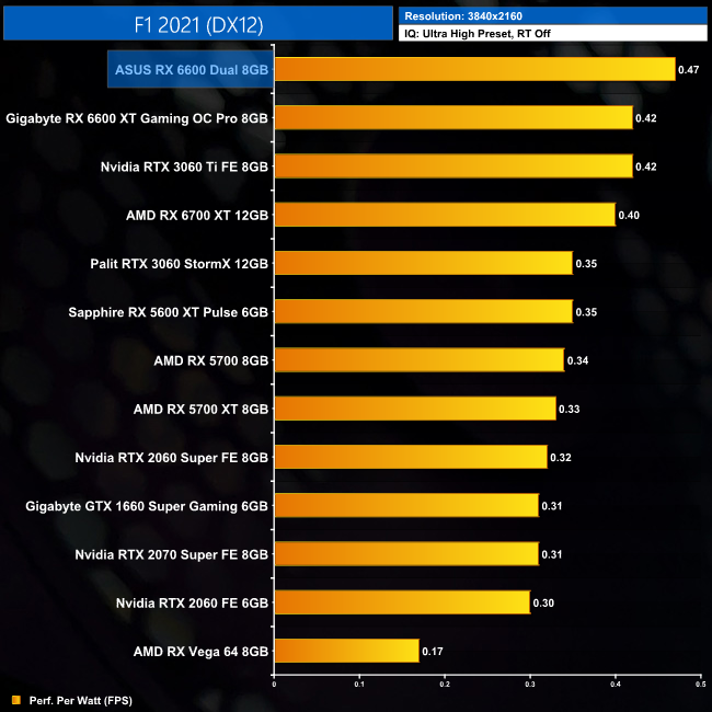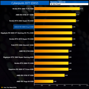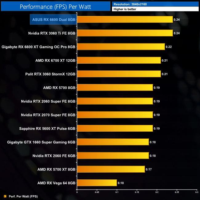 Lastly, while the RX 6600 really isn't intended for 4K gaming at all, it's still joint-top in terms of performance per Watt at this resolution, level with the RTX 3060 Ti.