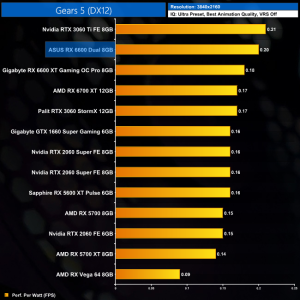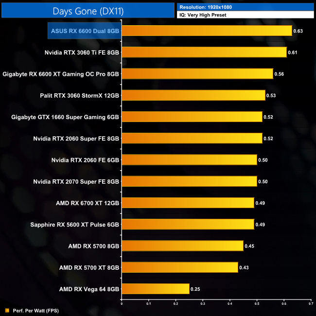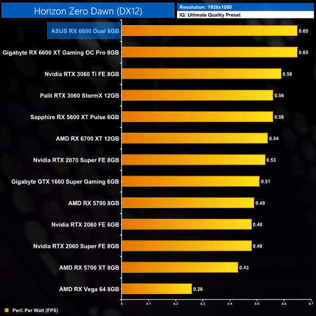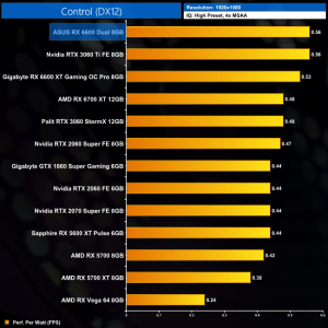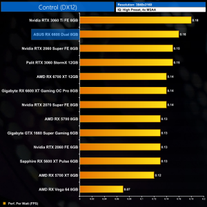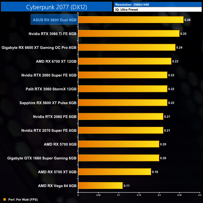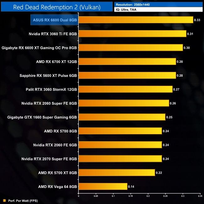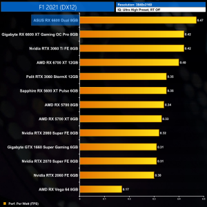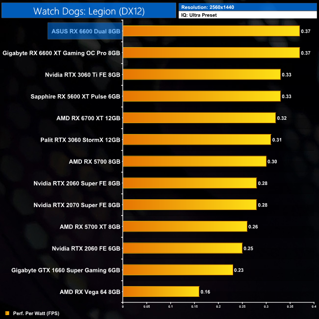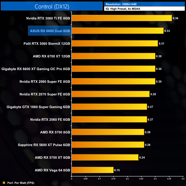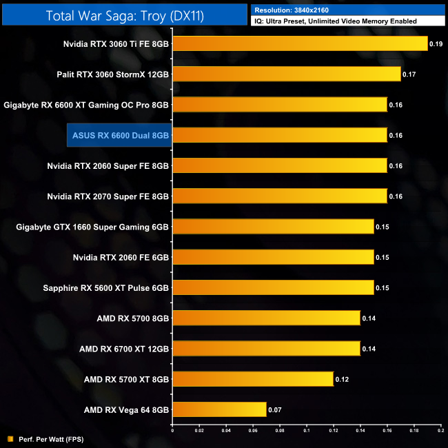 Lastly, while the RX 6600 really isn't intended for 4K gaming at all, it's still joint-top in terms of performance per Watt at this resolution, level with the RTX 3060 Ti.