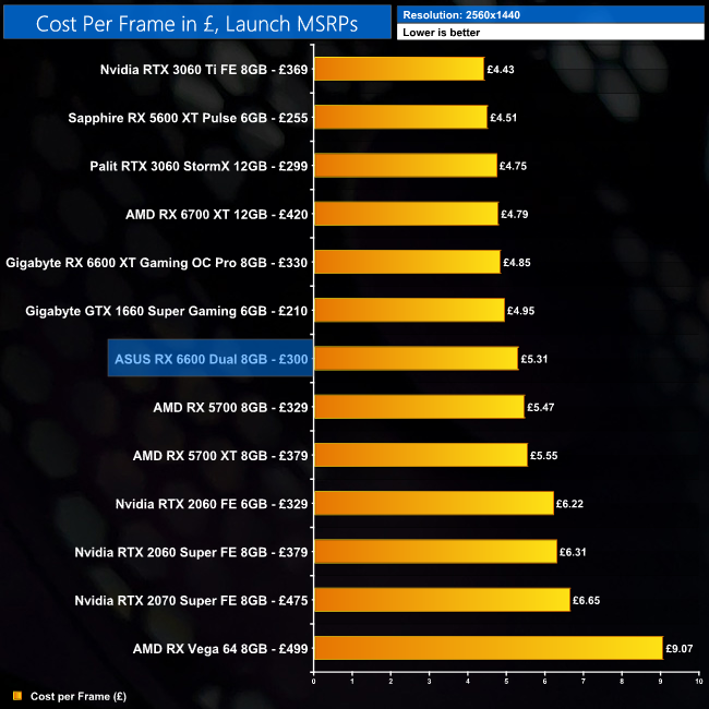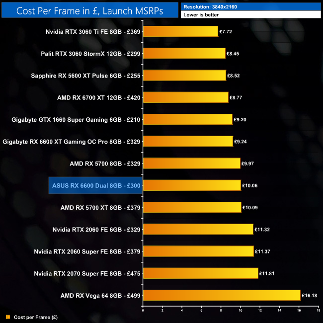 Using the average frame rate data presented earlier in the review, here we look at the cost per frame using the GBP (£) MSRP launch prices for each GPU.