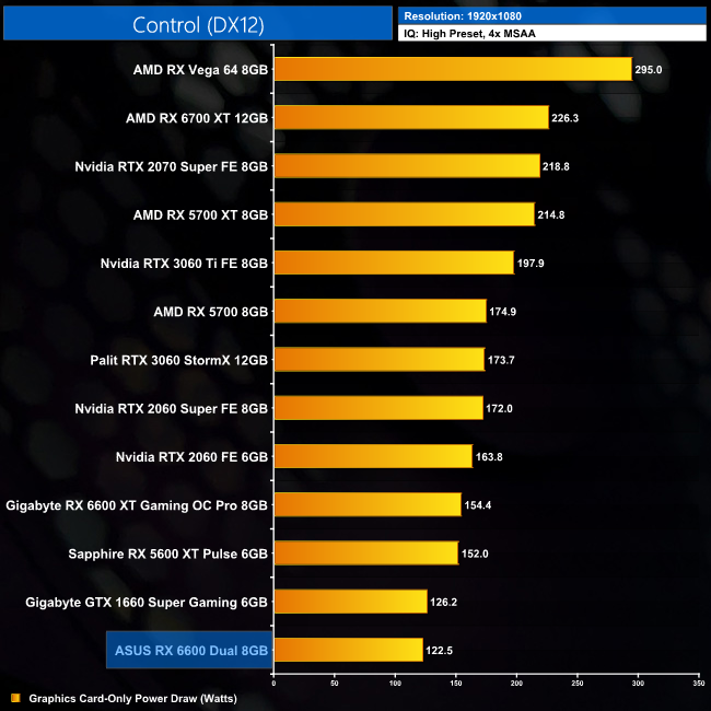 Power draw is exceptionally low for the RX 6600. Over our 12 games tested, it averaged 122.5W at 1080p, lower than even the GTX 1660 Super (which is a significantly slower GPU). As you can see from the individual charts above, power draw was also very consistent across the 12 games we tested.