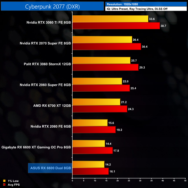 Ray tracing performance is next, starting with Cyberpunk 2077. As expected, the Ultra setting is far too demanding for the 6600 here and it can't even average over 20FPS at 1080p.