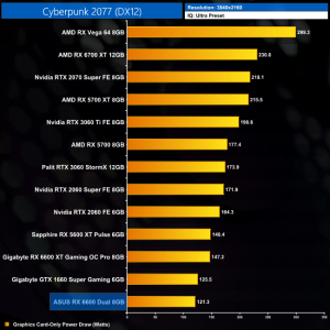 We measure system-wide power draw from the wall while running Cyberpunk 2077 for 30 minutes.