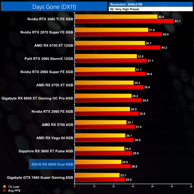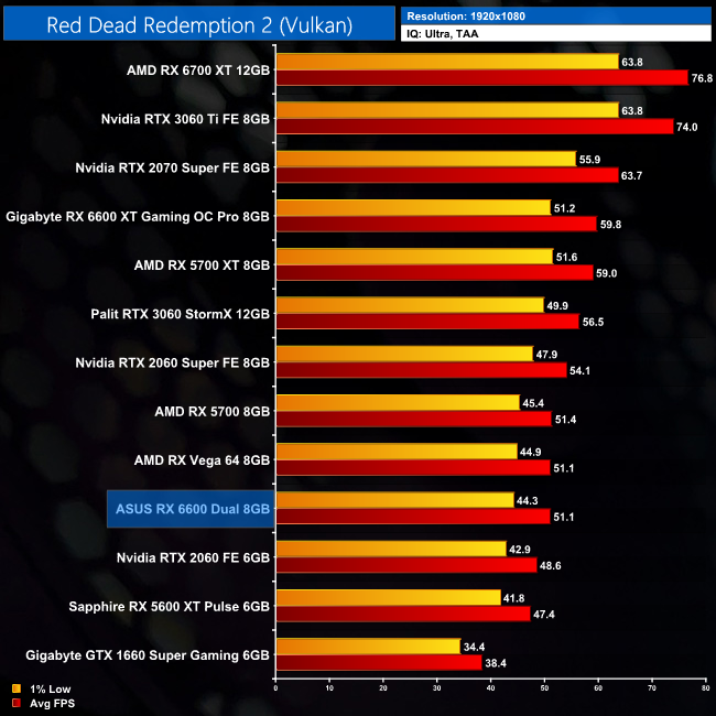 We get the lowest average frame rate of any game for the RX 6600 in Red Dead Redemption 2. It hit 51FPS using Ultra settings, putting it 10% behind the RTX 3060 but still 8% ahead of the RX 5600 XT.