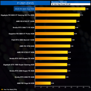 Combine the ~122W power draw with what is still decent 1080p gaming performance, and we have a new chart topper for our efficiency testing. That's right, at 1080p the RX 6600 delivers the most performance per Watt of any other GPU tested here, even beating the RX 6600 XT by 5%. Nvidia's closest rival, the RTX 3060 Ti, offers 12% less performance per Watt.