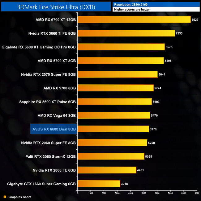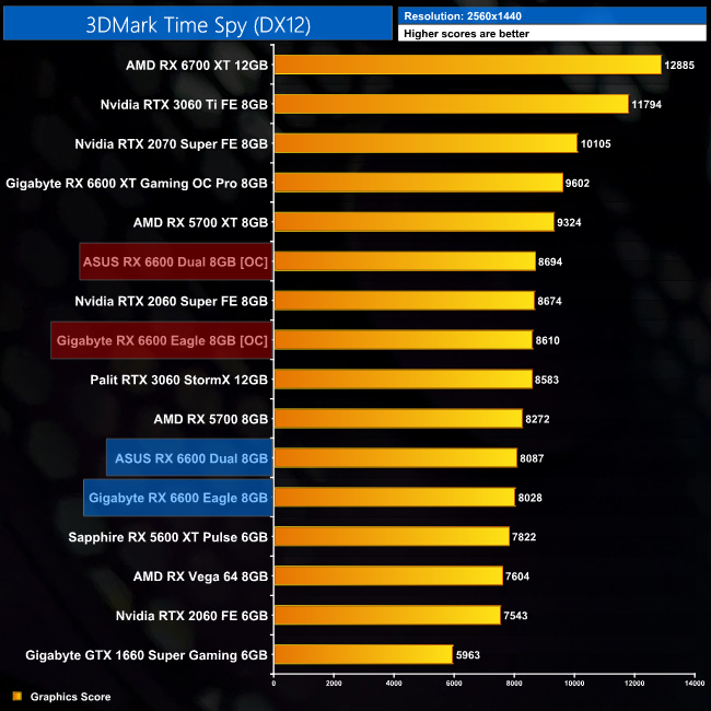 Kicking off with the 3DMark benchmarks, the RX 6600 does well in Fire Strike, sitting just behind the RX 5700, although it's only 6% faster than the RX 5600 XT. That margin decreases to 3% in the DX12 Time Spy benchmark, where the 6600 is also 6% slower than the RTX 3060.