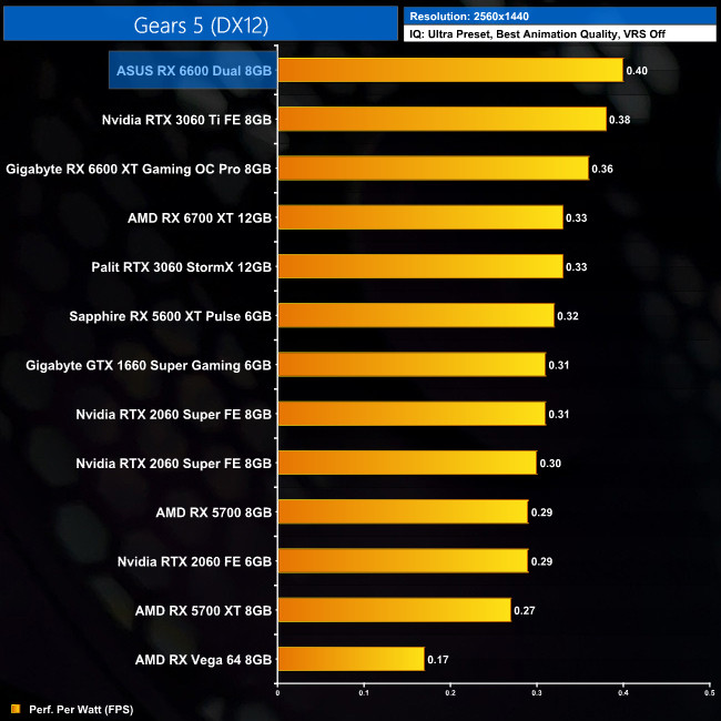 We have also implemented our recently-updated GPU power testing methodology as part of this review, so if you want to see power draw figures on a per-game and per-resolution basis, you can find that starting on page 29 of this review. We found that the RX 6600 is an exceptionally frugal GPU, typically drawing no more than 125W under load. That makes it the most efficient GPU of its class, offering more performance per Watt than even the RX 6600 XT or RTX 3060 Ti.