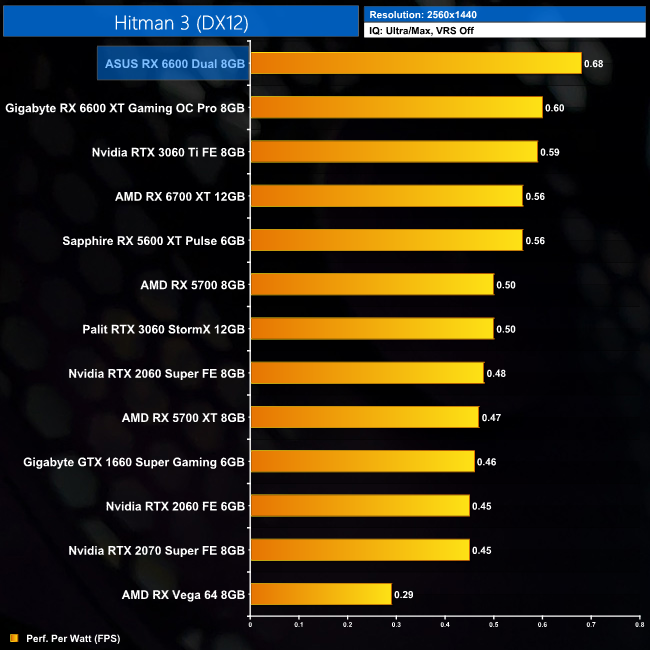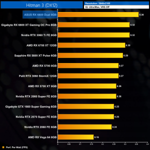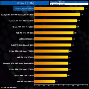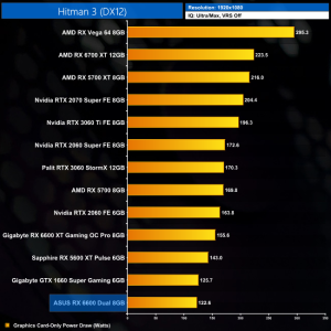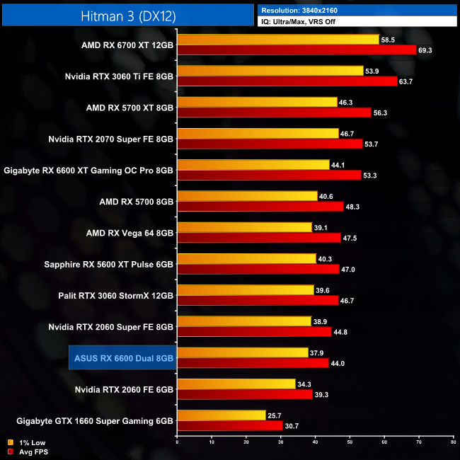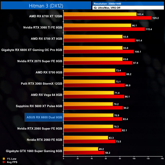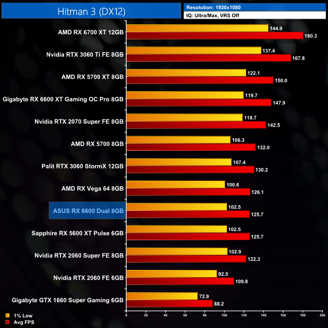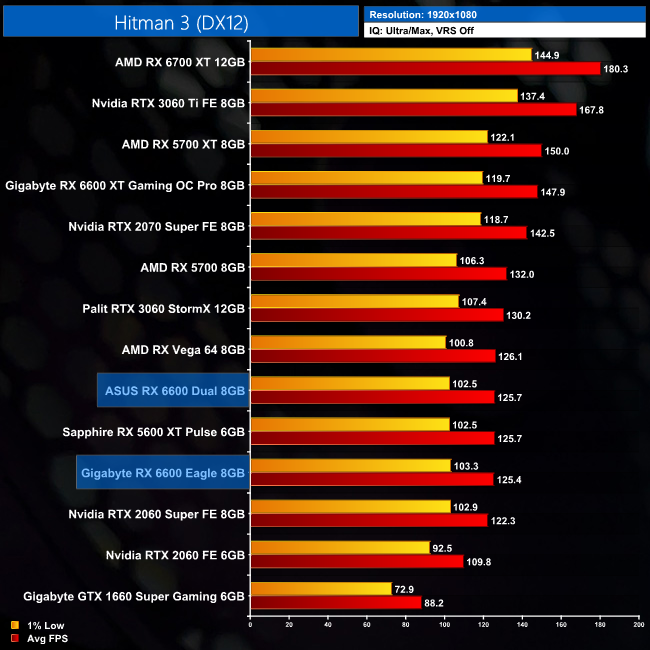Hitman 3 is another title where the RX 6600 is essentially matching the RX 5600 XT's performance – both GPUs average around 126FPS at 1080p, making both of them just fractionally slower than the RTX 3060.