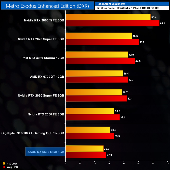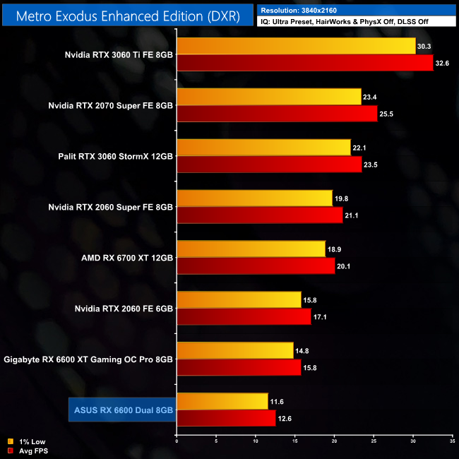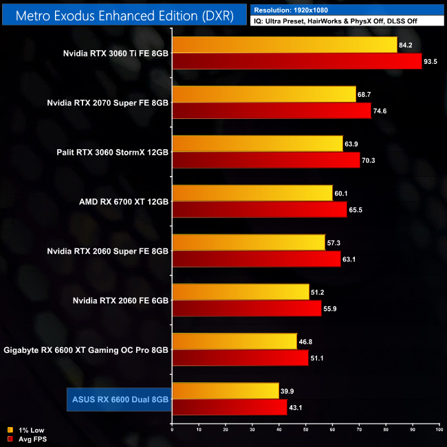 Metro Exodus Enhanced Edition is next, and despite offering a vast amount of ray tracing in game, performance isn't too bad even for the RX 6600, averaging over 40FPS. It's significantly slower than even the RTX 2060, but it's at least a playable experience.