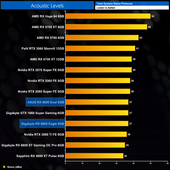 Noise levels is another strong area for both cards, as they both produced 37dBa – quiet enough to be drowned out by just a couple of case fans. For reference, our testing saw the Dual's fans ramp up to 40%, or 1480rpm, while the Eagle spun up to 56%, or 1760rpm.