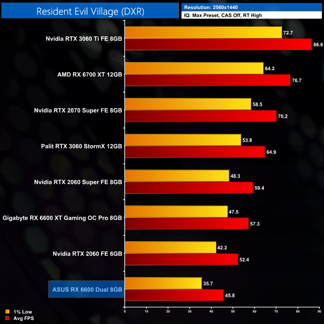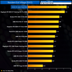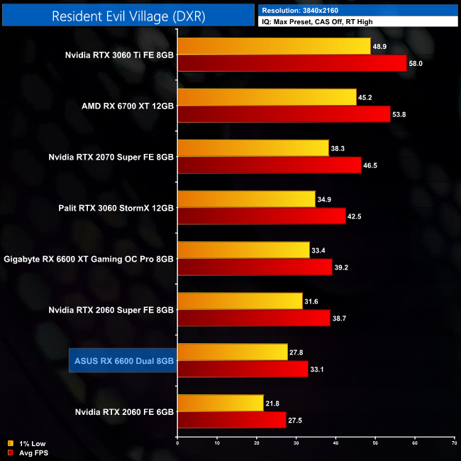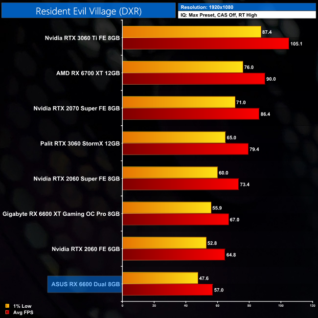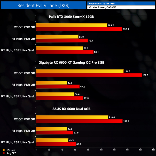 I wasn't too keen on the ray tracing implementation in Resident Evil Village, but it's also not too intensive on a GPU. At 1080p the RX 6600 averages just under 60FPS with ray tracing set to High, though it is still behind the RTX 2060 – Nvidia's slowest ray tracing GPU that launched back in 2019.