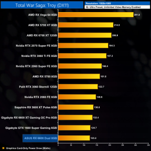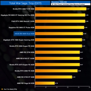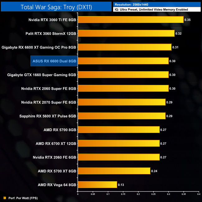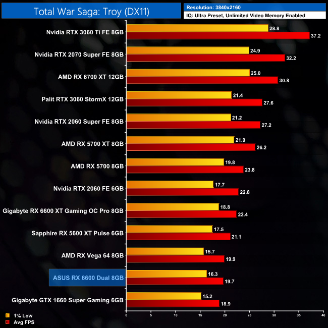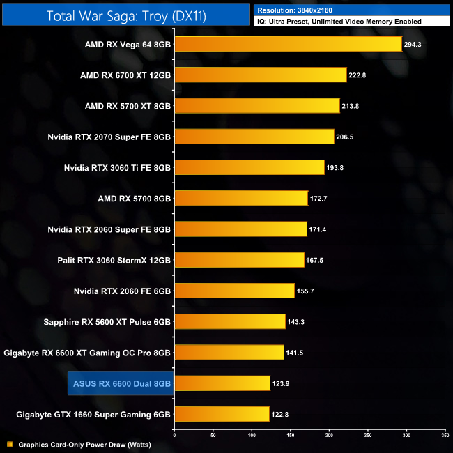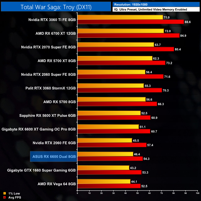 We had some fun and games with Total War Saga: Troy for this review. It seems between now and my previous testing of this game for the RX 6600 XT's launch in August, an update came along and reduced performance for all of the GPUs tested. Interestingly, it seemed to have the biggest negative impact on the 6600 and 6600 XT, as the 6600 is actually 11% slower than the 5600 XT at both 1080p and 1440p. My guess is the limited memory bandwidth could be a factor here, as could the PCIe Gen4 x8 configuration which we're running at Gen3 x8 due to using the Z490 platform.