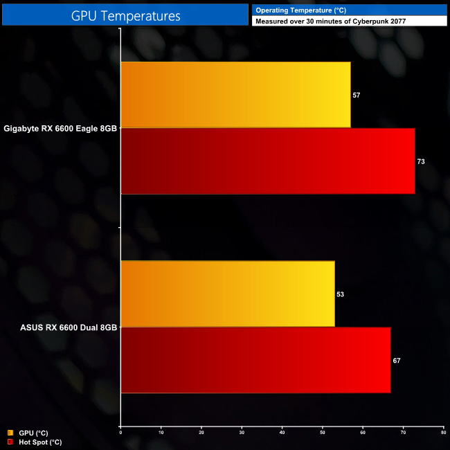 As for temperature testing, both the Dual and Eagle are more than a match for the RX 6600 GPU. Both saw peak temperatures stay below 60C, which is quite incredible really, while the Dual's hotspot peaked at 67C compared to 73C for the Eagle. I'd imagine most of the RX 6600 cards will be using the same cooler designs as the RX 6600 XT models, so we would expect better thermals as the 6600 is a lower-power chip than the 6600 XT.