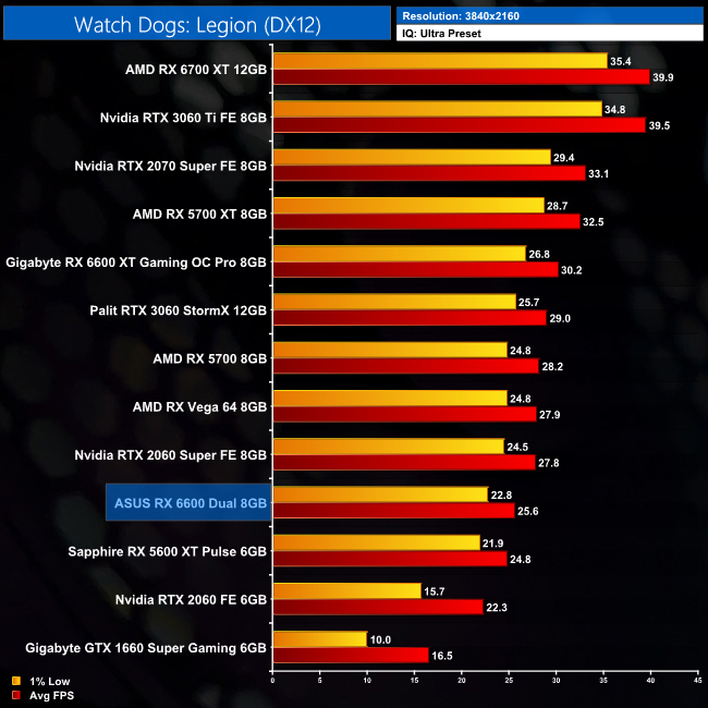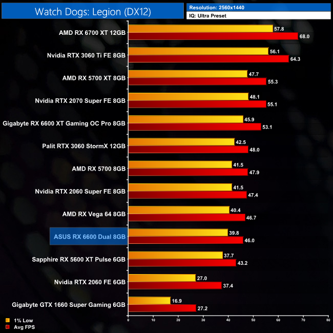 Lastly, we close out with Watch Dogs: Legion. Despite being an Nvidia sponsored title, AMD's GPUs do well here and the 6600 is just a touch faster than the RTX 3060 at 1080p, while it's also 10% faster than the RX 5600 XT.