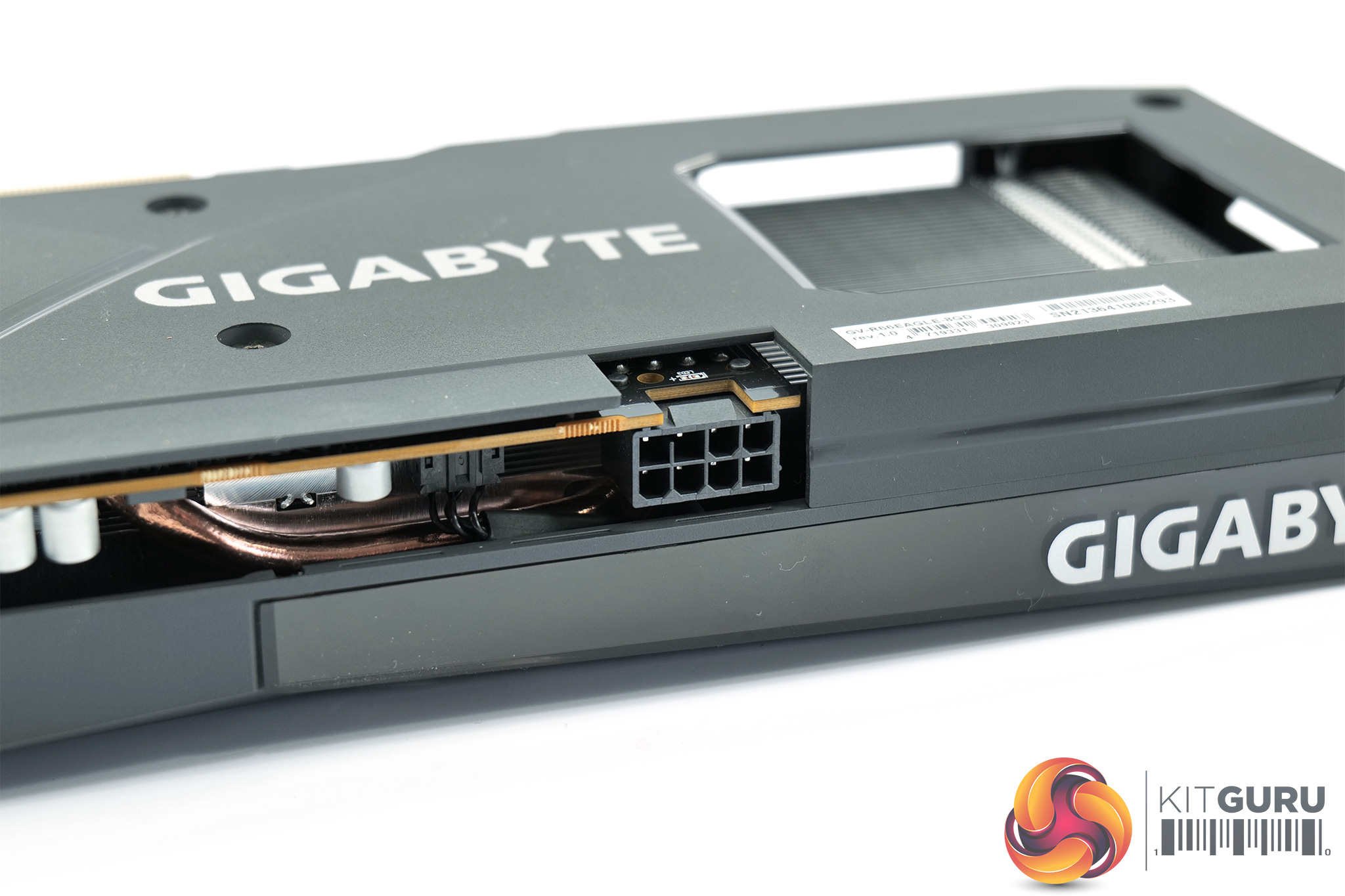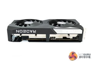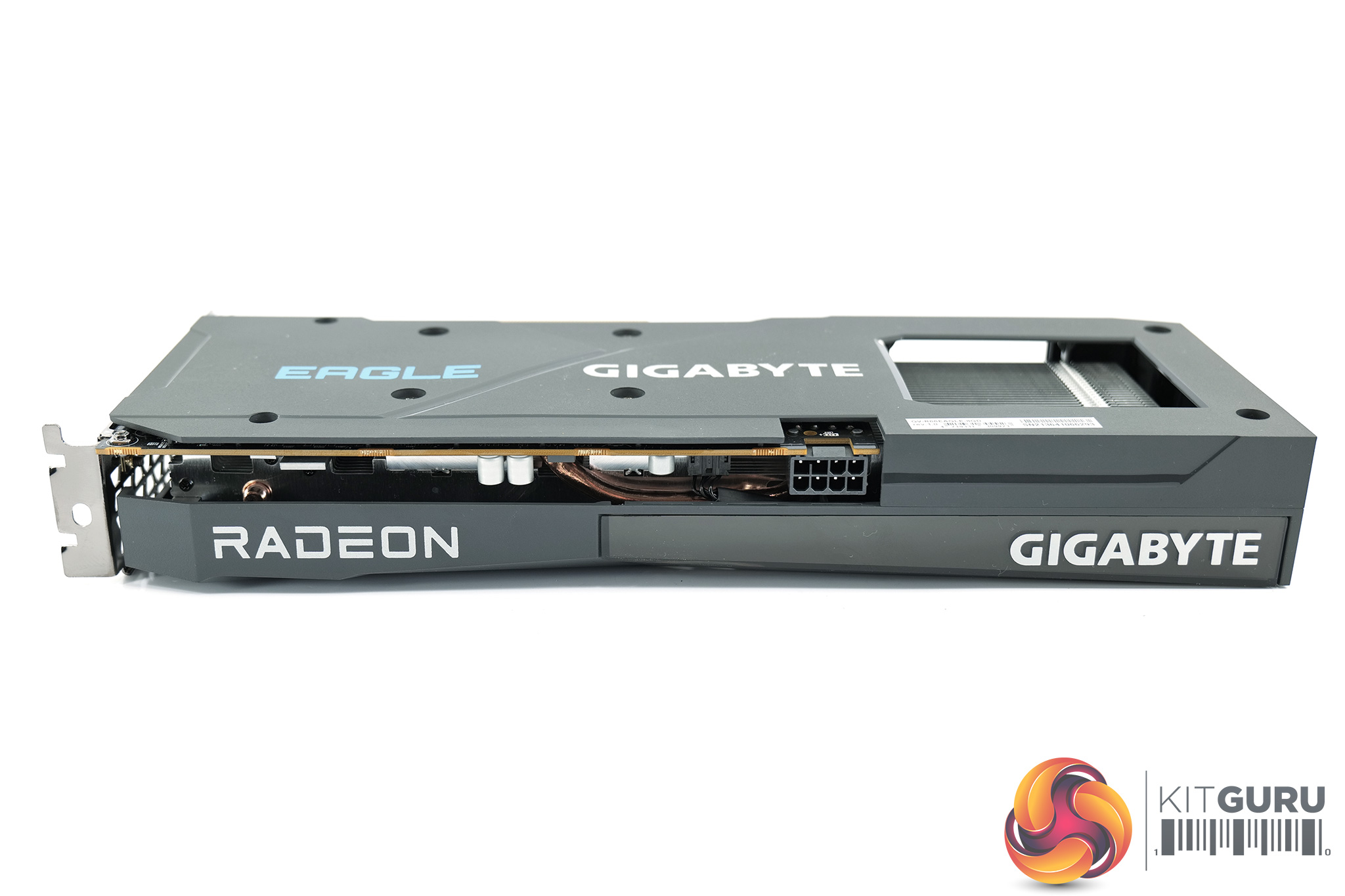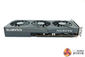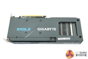 Over on the front edge of the shroud, both the Radeon and Gigabyte logos are printed in white. We can also note a blue Eagle logo on the backplate, though do note the backplate itself is made from textured plastic, rather than metal, something I do find a bit disappointing.