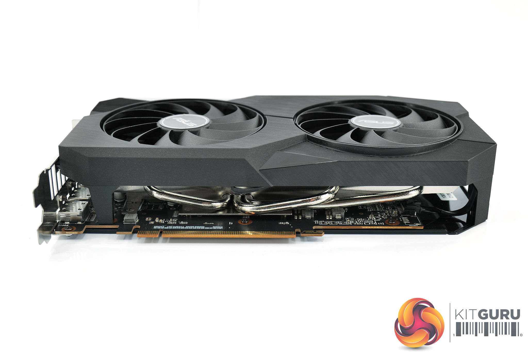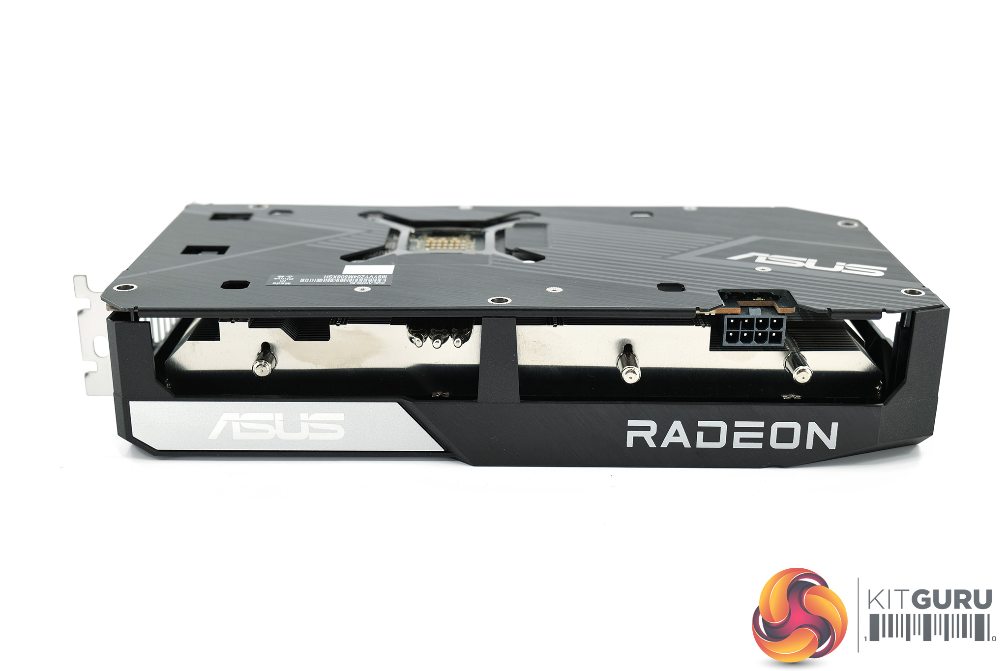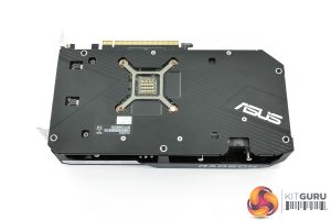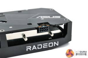 Over on the front edge of the shroud we can note the ASUS and Radeon logos, while a metal backplate is also visible once we turn the card over. It's entirely black apart from the silver ASUS logo, while there's a cut-out behind the GPU die.