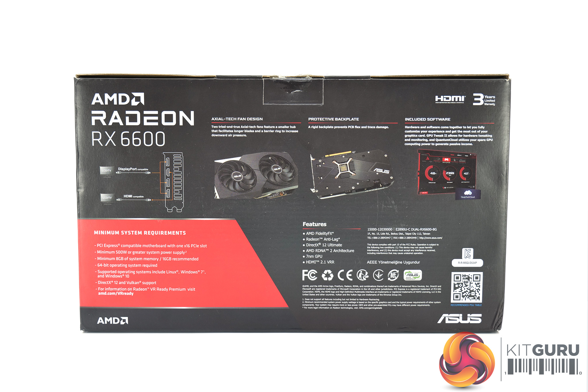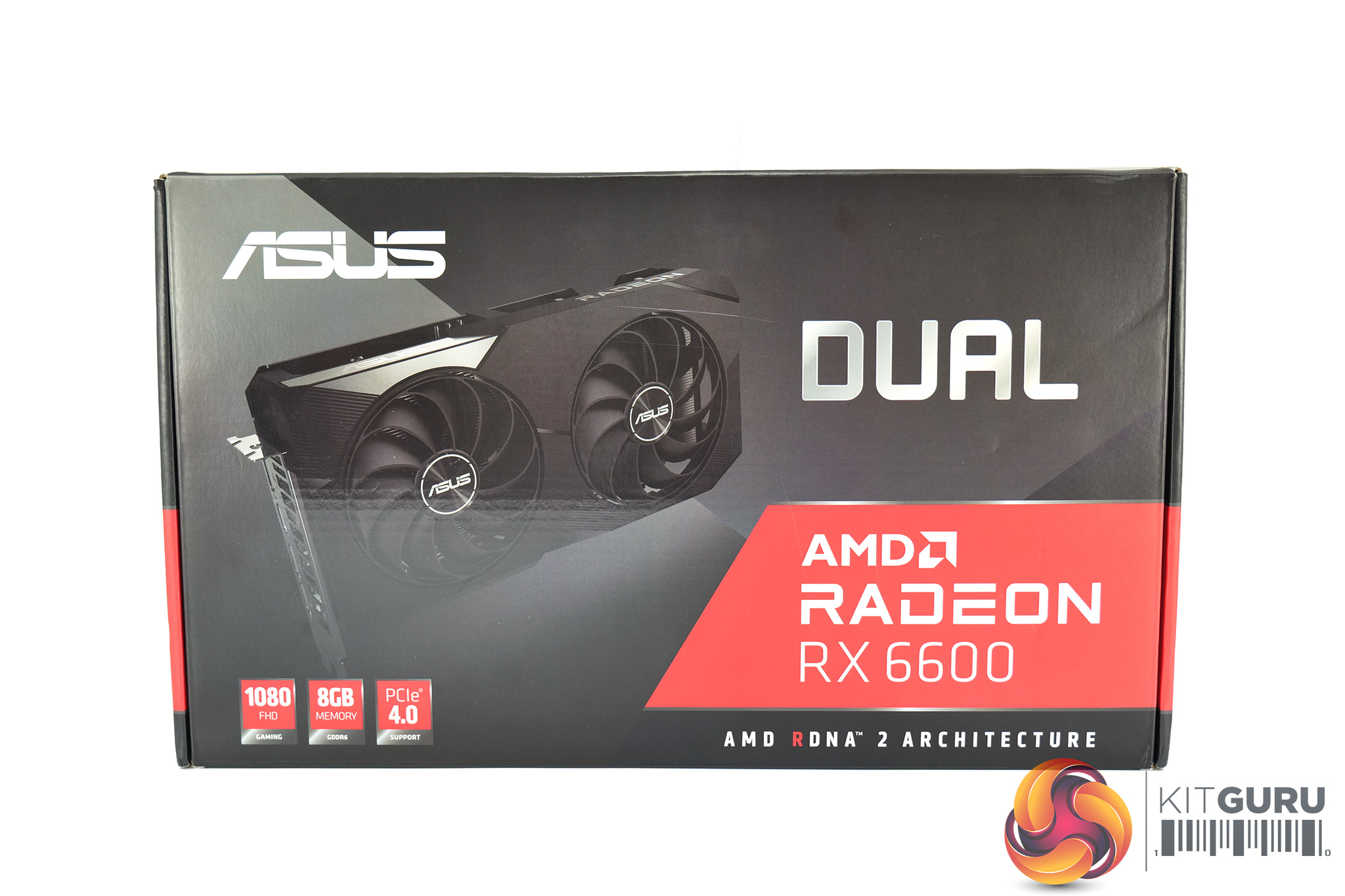The ASUS RX 6600 Dual ships in a dark box, with a photo of the card visible on the front. On the back, ASUS has highlighted various key features of the card.