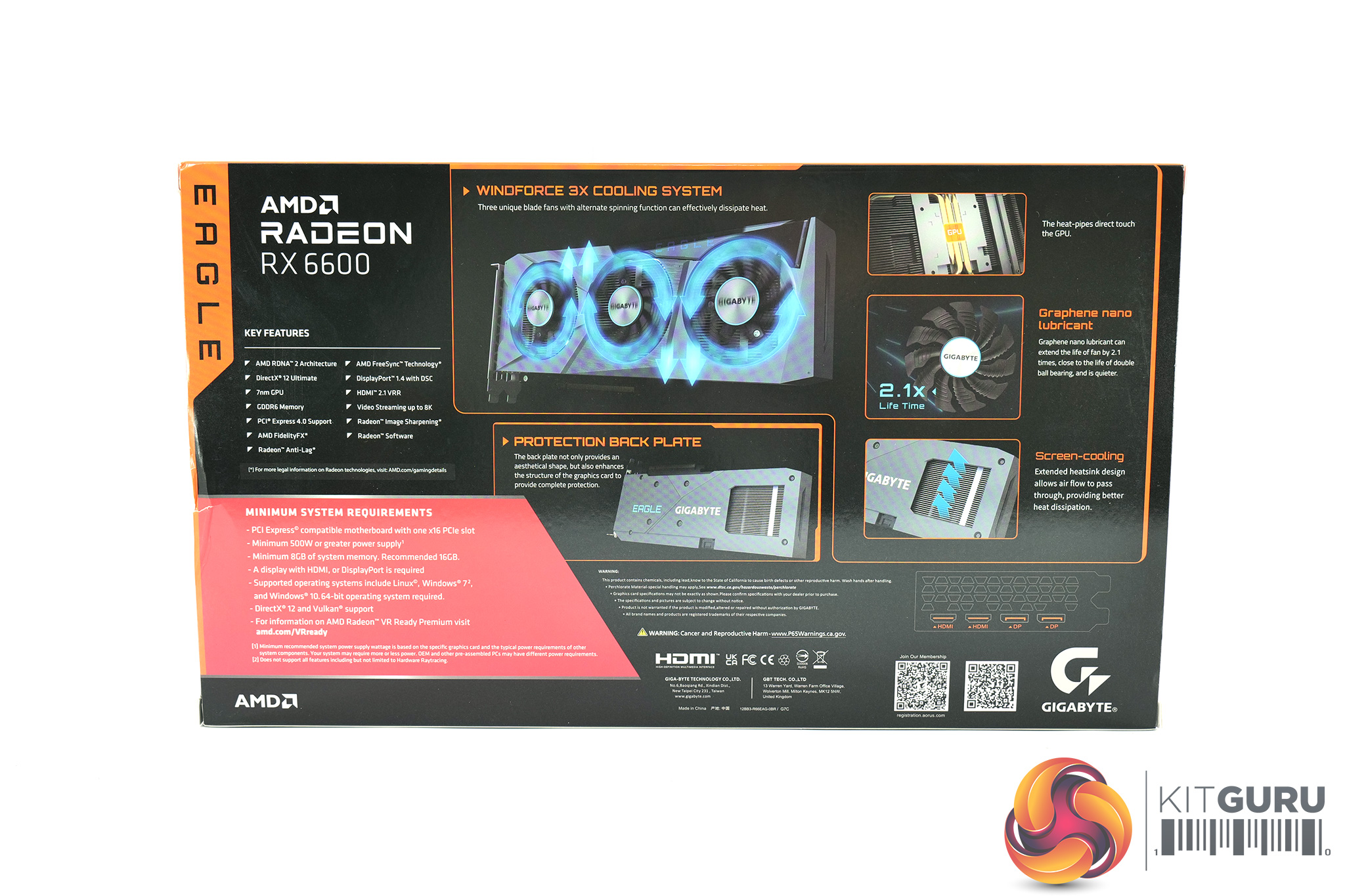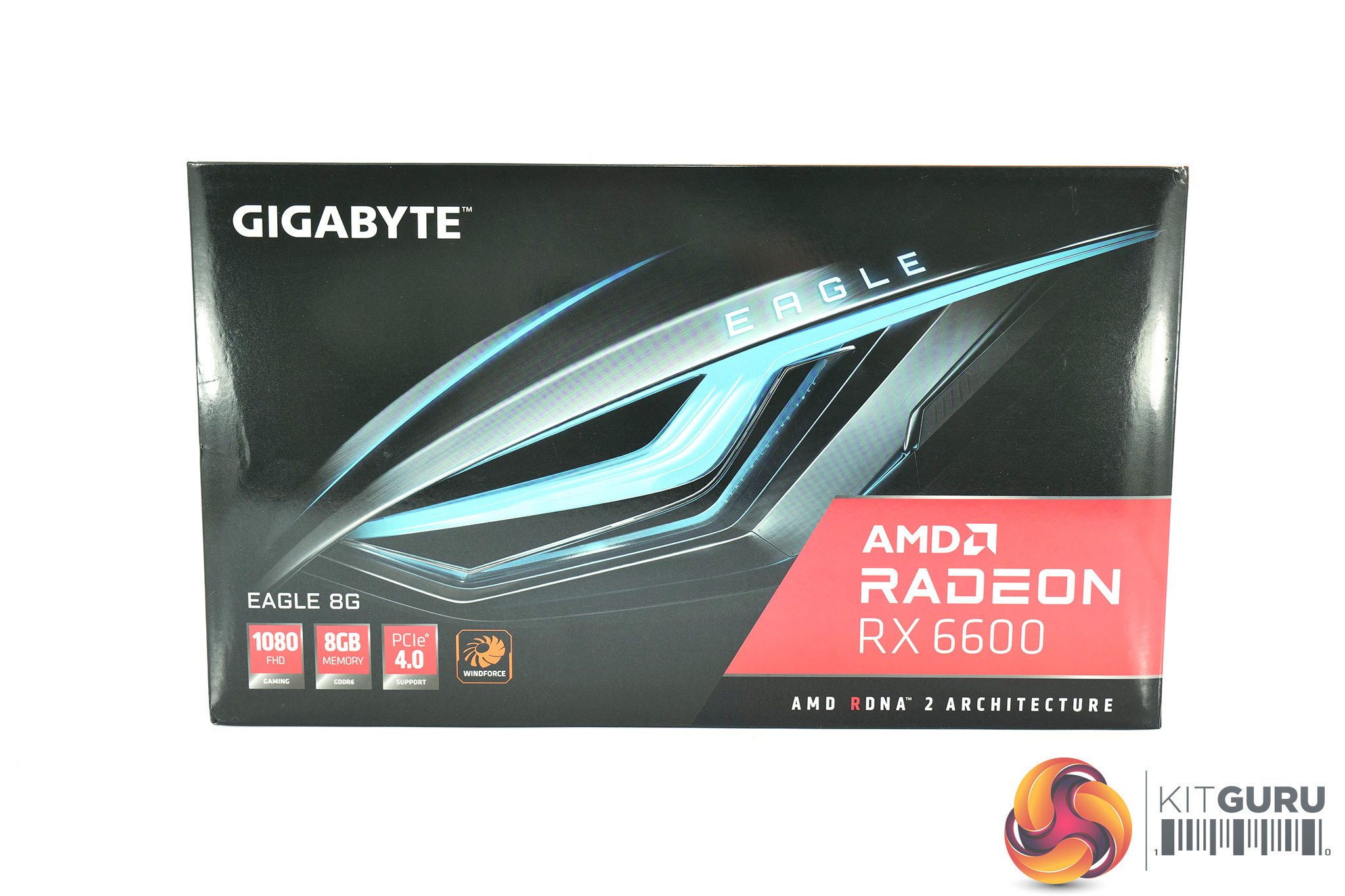 As for the Gigabyte RX 6600 Eagle, this ships in a dark box with Gigabyte's robotic eye logo dominating the front. On the back, we can note several key features of the card's design.