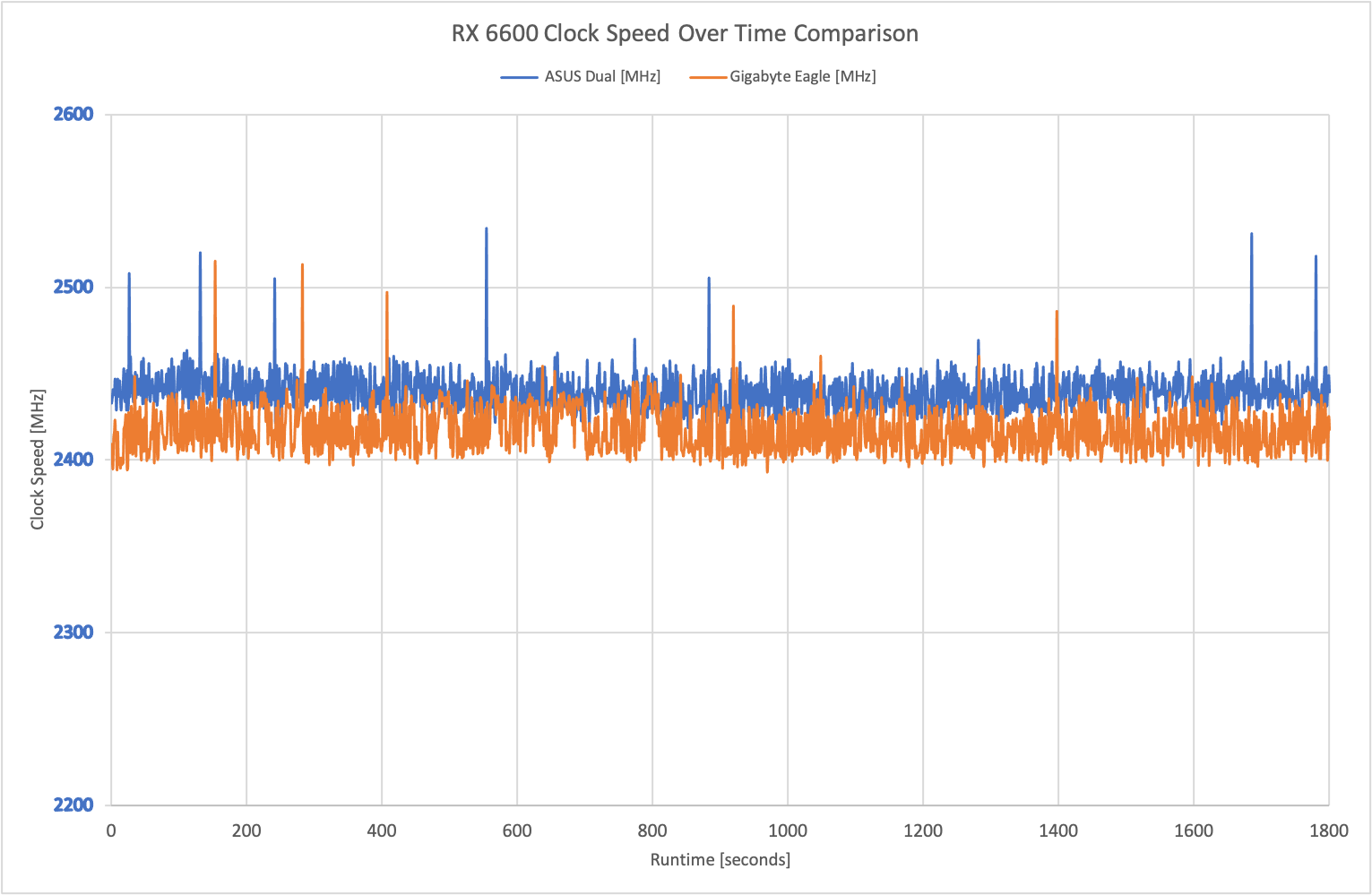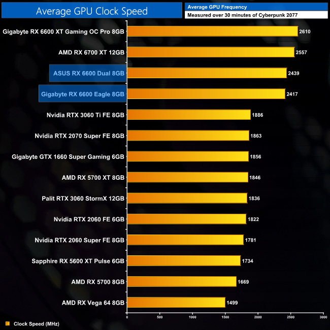 The reason for the incredibly minor differences in gaming performance between the Dual and the Eagle is down to the fact the Dual's GPU frequency boosted fractionally higher – averaging 2439MHz compared to 2417MHz. It's really quite inconsequential, but it was measurable over our testing.