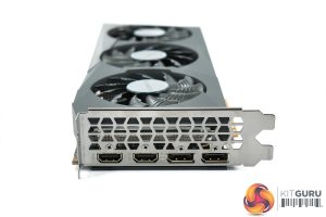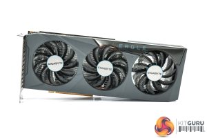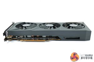 Gigabyte is sticking with a triple-fan design for its RX 6600 offering, though these fans are smaller at 80mm across. As always with a Gigabyte graphics card, the central fan spins in reverse relative to the outer two which should reduce turbulence and thus increase airflow pressure down onto the heatsink.